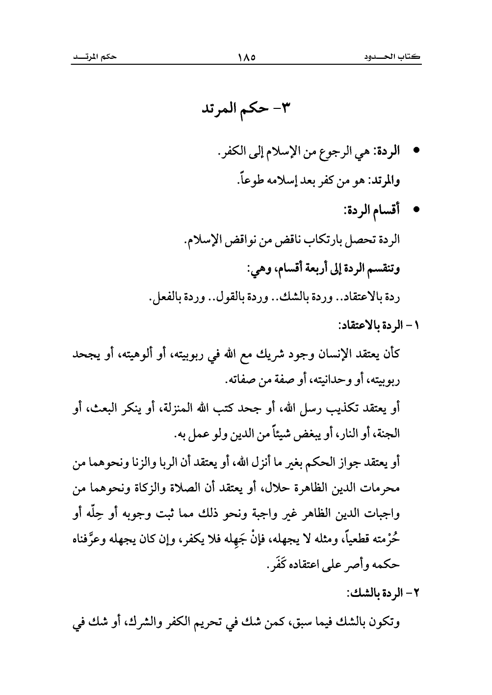 - الردة: هي الرجوع من الإسلام إلى الكفر.