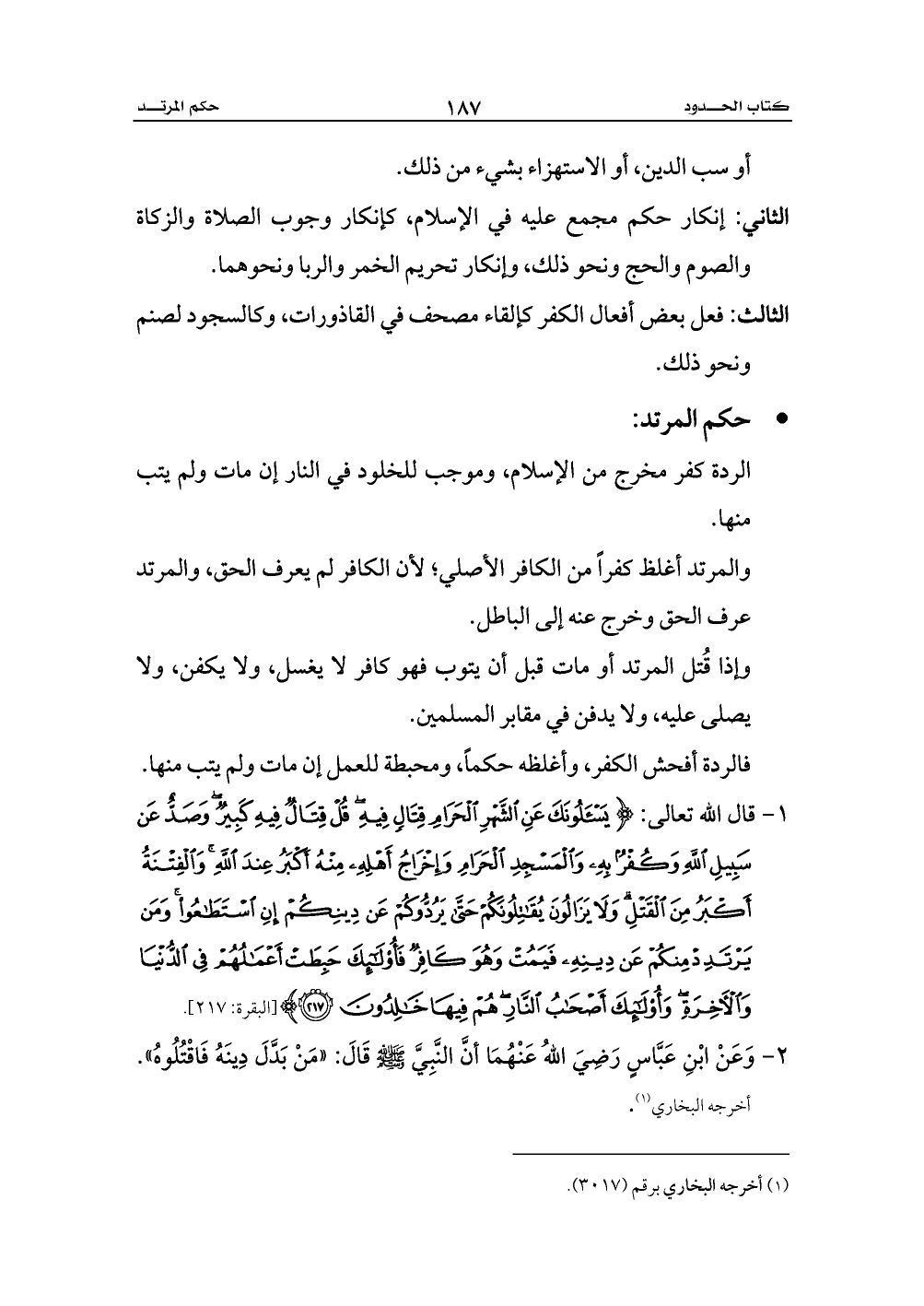 2 - وَعَنْ ابْنِ عَبَّاسٍ رَضِيَ اللهُ عَنْهُمَا أنَّ النَّبِيَّ - صلى الله عليه وسلم - قَالَ: «مَنْ بَدَّلَ دِينَهُ فَاقْتُلُوهُ». أخرجه البخاري (¬1).
