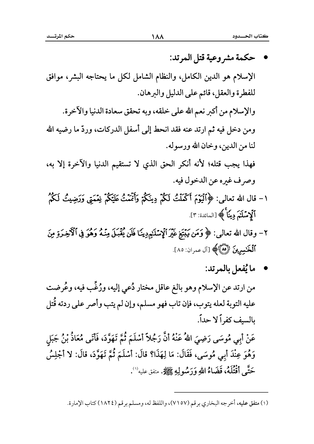 عَنْ أبِي مُوسَى رَضِيَ اللهُ عَنْهُ أنَّ رَجُلاً أسْلَمَ ثُمَّ تَهَوَّدَ، فَأتَى مُعَاذُ بْنُ جَبَلٍ وَهُوَ عِنْدَ أبِي مُوسَى، فَقَالَ: مَا لِهَذَا؟ قالَ: أسْلَمَ ثُمَّ تَهَوَّدَ، قالَ: لا أجْلِسُ حَتَّى أقْتُلَهُ، قَضَاءُ اللهِ وَرَسُولِهِ - صلى الله عليه وسلم -. متفق عليه (¬1).