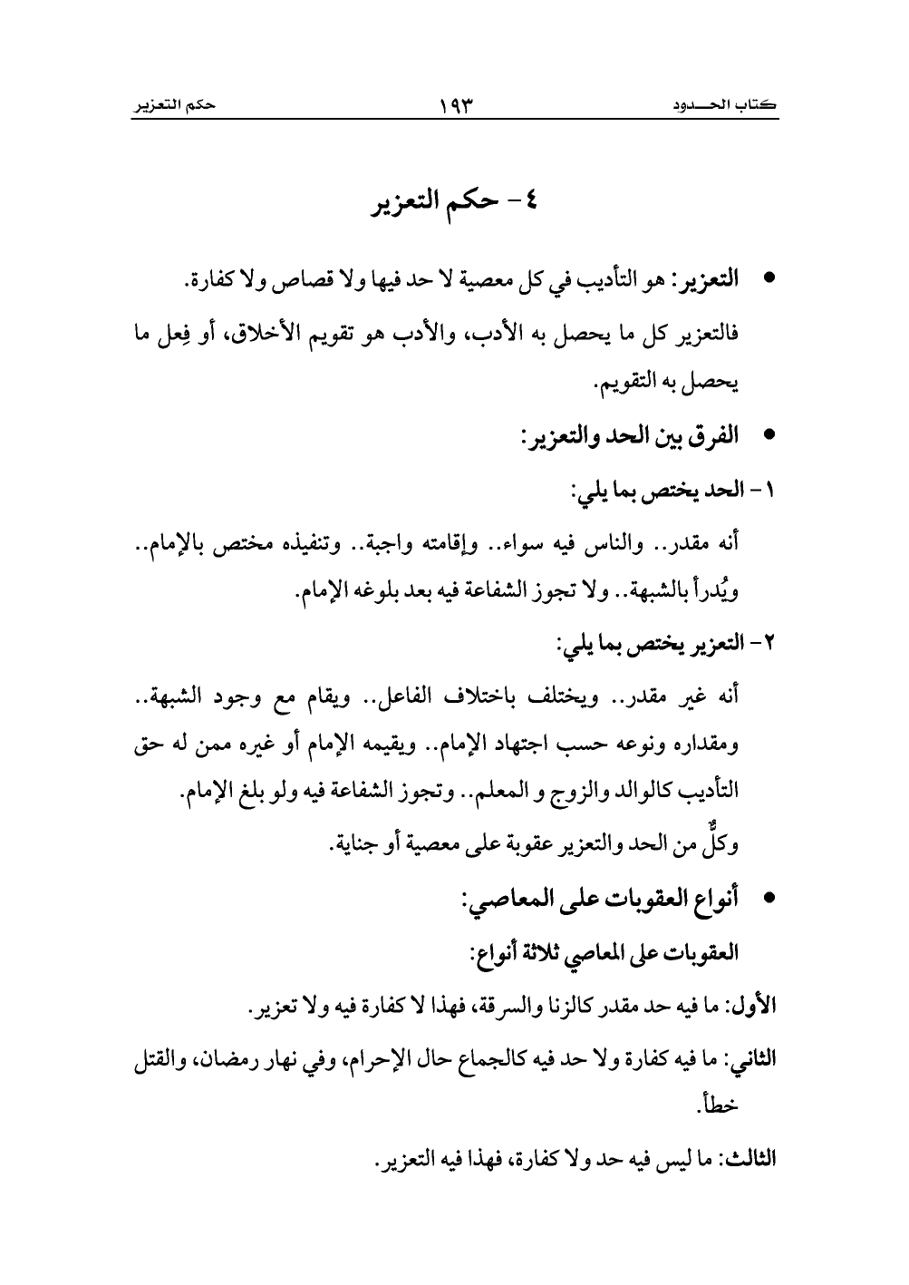 أنه غير مقدر .. ويختلف باختلاف الفاعل .. ويقام مع وجود الشبهة .. ومقداره ونوعه حسب اجتهاد الإمام .. ويقيمه الإمام أو غيره ممن له حق التأديب كالوالد والزوج والمعلم .. وتجوز الشفاعة فيه ولو بلغ الإمام.