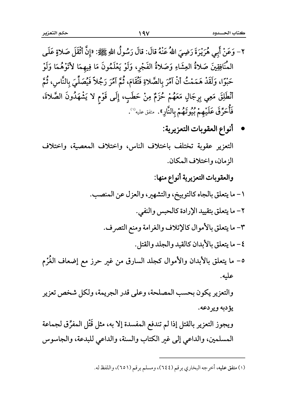 2 - وَعَنْ أَبِي هُرَيْرَةَ رَضِيَ اللهُ عَنْهُ قالَ: قالَ رَسُولُ اللهِ - صلى الله عليه وسلم -: «إِنَّ أثْقَلَ صَلاةٍ عَلَى المُنَافِقِينَ صَلاةُ العِشَاءِ وَصَلاةُ الفَجْرِ، وَلَوْ يَعْلَمُونَ مَا فِيهِمَا لأتَوْهُمَا وَلَوْ حَبْوًا، وَلَقَدْ هَمَمْتُ أنْ آمُرَ بِالصَّلاةِ فَتُقَامَ، ثُمَّ آمُرَ رَجُلاً فَيُصَلِّيَ بِالنَّاسِ، ثُمَّ أنْطَلِقَ مَعِي بِرِجَالٍ مَعَهُمْ حُزَمٌ مِنْ حَطَبٍ، إِلَى قَوْمٍ لا يَشْهَدُونَ الصَّلاةَ، فَأُحَرِّقَ عَلَيْهِمْ بُيُوتَهُمْ بِالنَّارِ». متفق عليه (¬1).