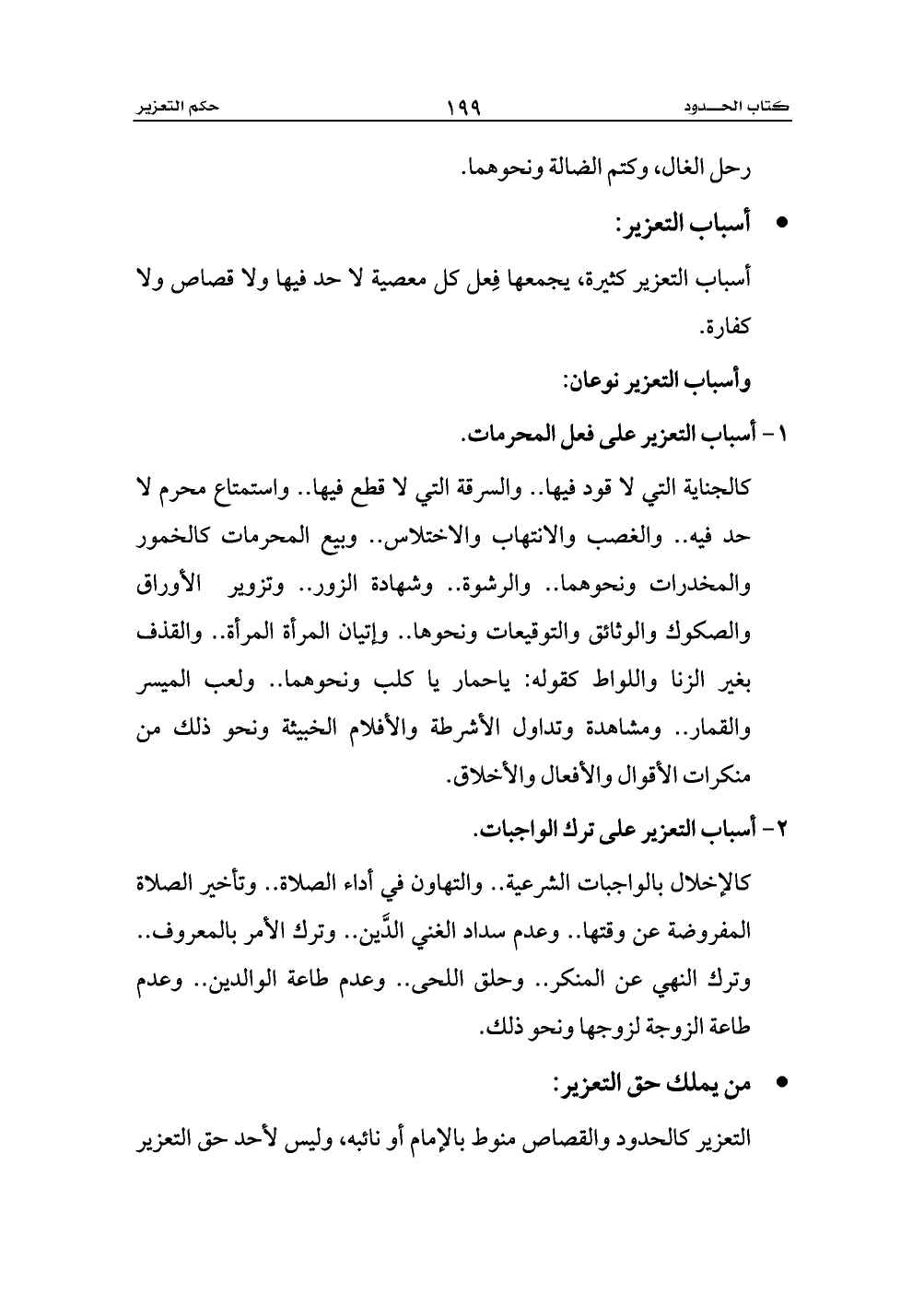 أسباب التعزير كثيرة، يجمعها فِعل كل معصية لا حد فيها ولا قصاص ولا كفارة.