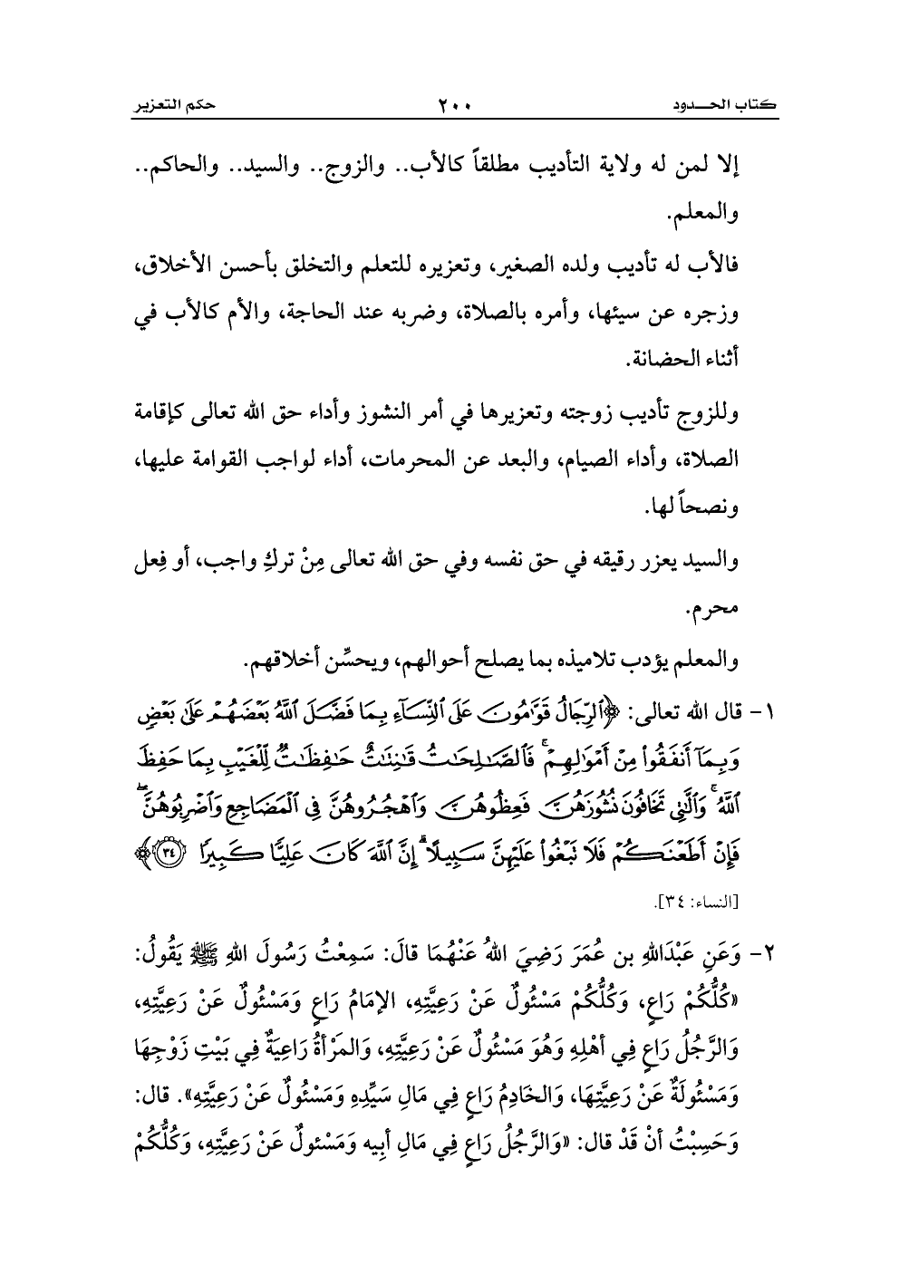 2 - وَعَنِ عَبْدَاللهِ بن عُمَرَ رَضِيَ اللهُ عَنْهُمَا قالَ: سَمِعْتُ رَسُولَ اللهِ - صلى الله عليه وسلم - يَقُولُ: «كُلُّكُمْ رَاعٍ، وَكُلُّكُمْ مَسْئُولٌ عَنْ رَعِيَّتِهِ، الإمَامُ رَاعٍ وَمَسْئُولٌ عَنْ رَعِيَّتِهِ، وَالرَّجُلُ رَاعٍ فِي أهْلِهِ وَهُوَ مَسْئُولٌ عَنْ رَعِيَّتِهِ، وَالمَرْأةُ رَاعِيَةٌ فِي بَيْتِ زَوْجِهَا