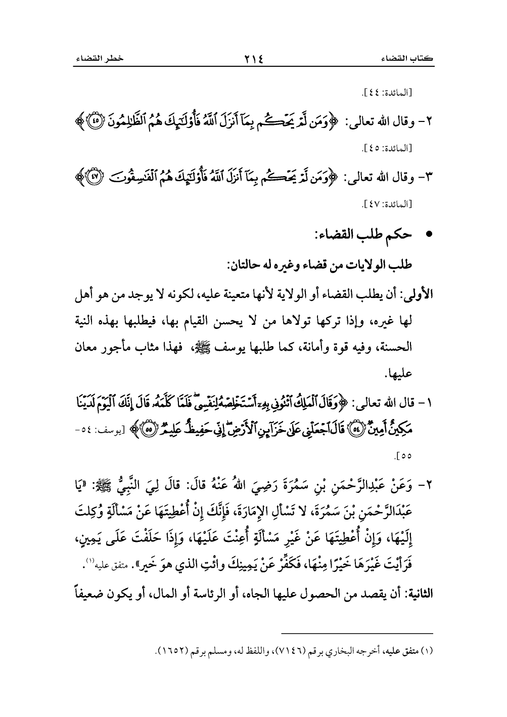 الأولى: أن يطلب القضاء أو الولاية لأنها متعينة عليه، لكونه لا يوجد من هو أهل لها غيره، وإذا تركها تولاها من لا يحسن القيام بها، فيطلبها بهذه النية الحسنة، وفيه قوة وأمانة، كما طلبها يوسف - صلى الله عليه وسلم -، فهذا مثاب مأجور معان عليها.