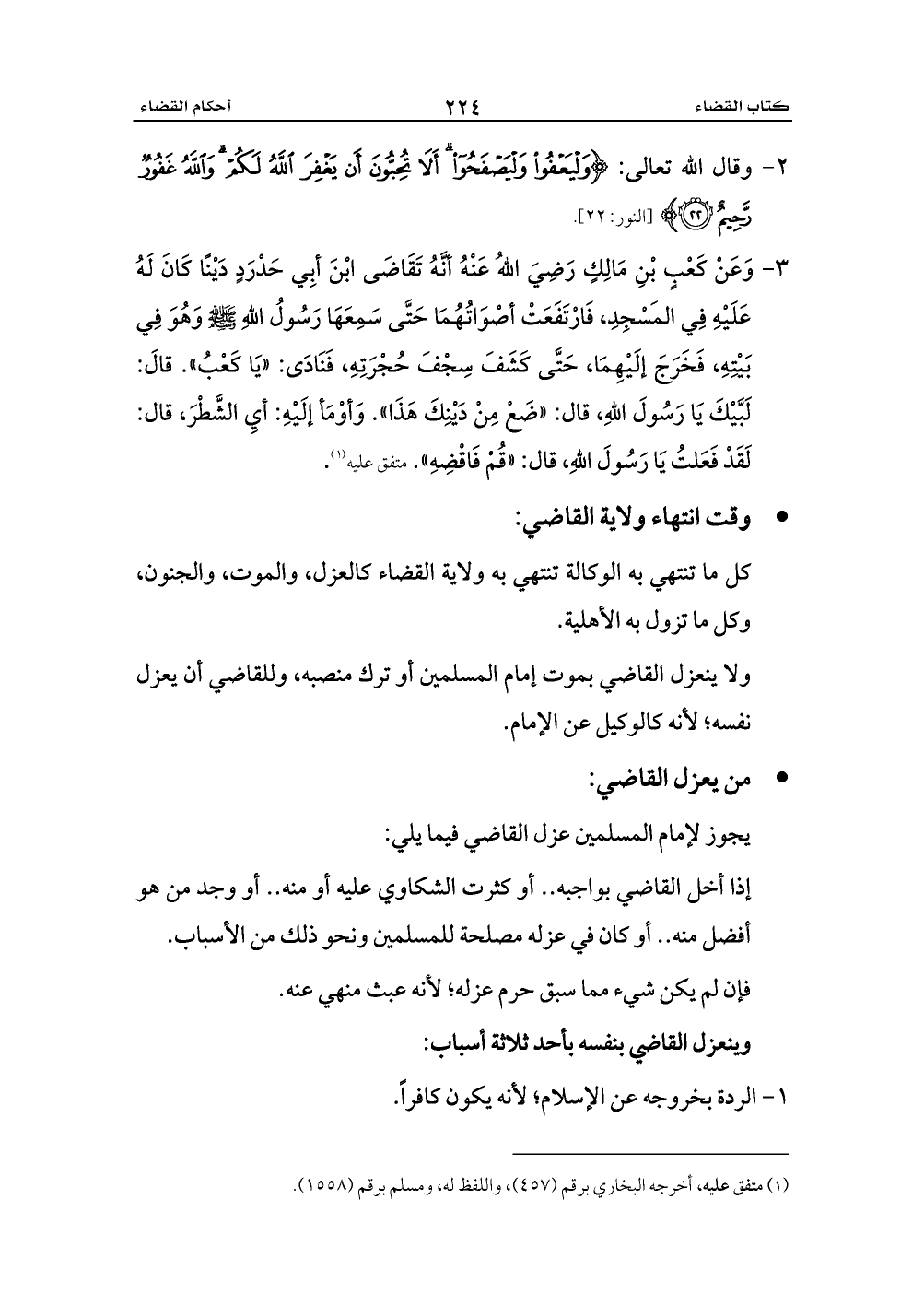 3 - وَعَنْ كَعْبٍ بْنِ مَالِكٍ رَضِيَ اللهُ عَنْهُ أنَّهُ تَقَاضَى ابْنَ أبِي حَدْرَدٍ دَيْنًا كَانَ لَهُ عَلَيْهِ فِي المَسْجِدِ، فَارْتَفَعَتْ أصْوَاتُهُمَا حَتَّى سَمِعَهَا رَسُولُ اللهِ - صلى الله عليه وسلم - وَهُوَ فِي بَيْتِهِ، فَخَرَجَ إلَيْهِمَا، حَتَّى كَشَفَ سِجْفَ حُجْرَتِهِ، فَنَادَى: «يَا كَعْبُ». قالَ: لَبَّيْكَ يَا رَسُولَ اللهِ، قال: «ضَعْ مِنْ دَيْنِكَ هَذَا». وَأوْمَأ إلَيْهِ: أيِ الشَّطْرَ، قال: لَقَدْ فَعَلتُ يَا رَسُولَ اللهِ، قال: «قُمْ فَاقْضِهِ». متفق عليه (¬1).