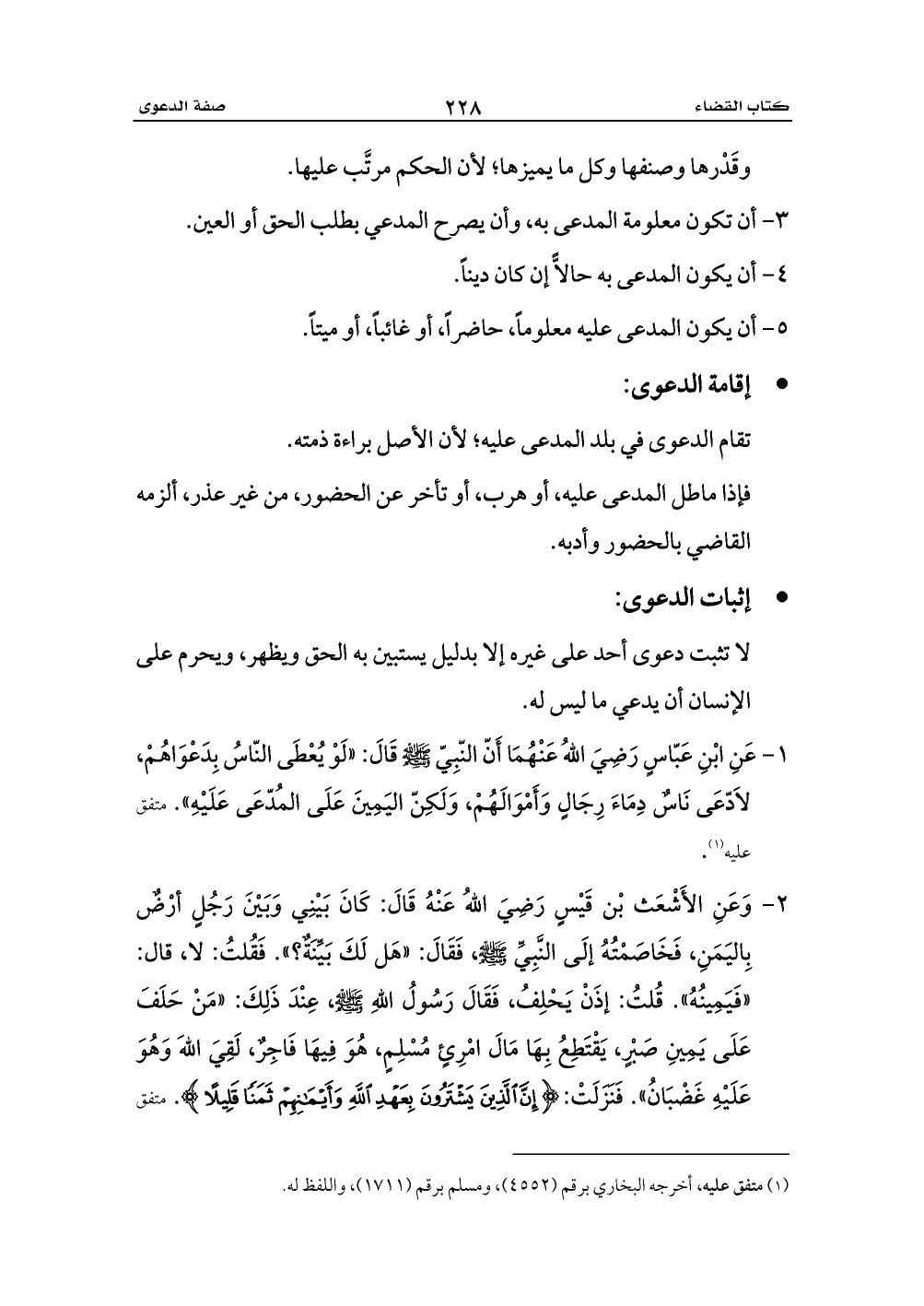 1 - عَنِ ابْنِ عَبّاسٍ رَضِيَ اللهُ عَنْهُمَا أَنّ النّبِيّ - صلى الله عليه وسلم - قَالَ: «لَوْ يُعْطَى النّاسُ بِدَعْوَاهُمْ، لاَدّعَى نَاسٌ دِمَاءَ رِجَالٍ وَأَمْوَالَهُمْ، وَلَكِنّ اليَمِينَ عَلَى المُدّعَى عَلَيْهِ». متفق عليه (¬1).