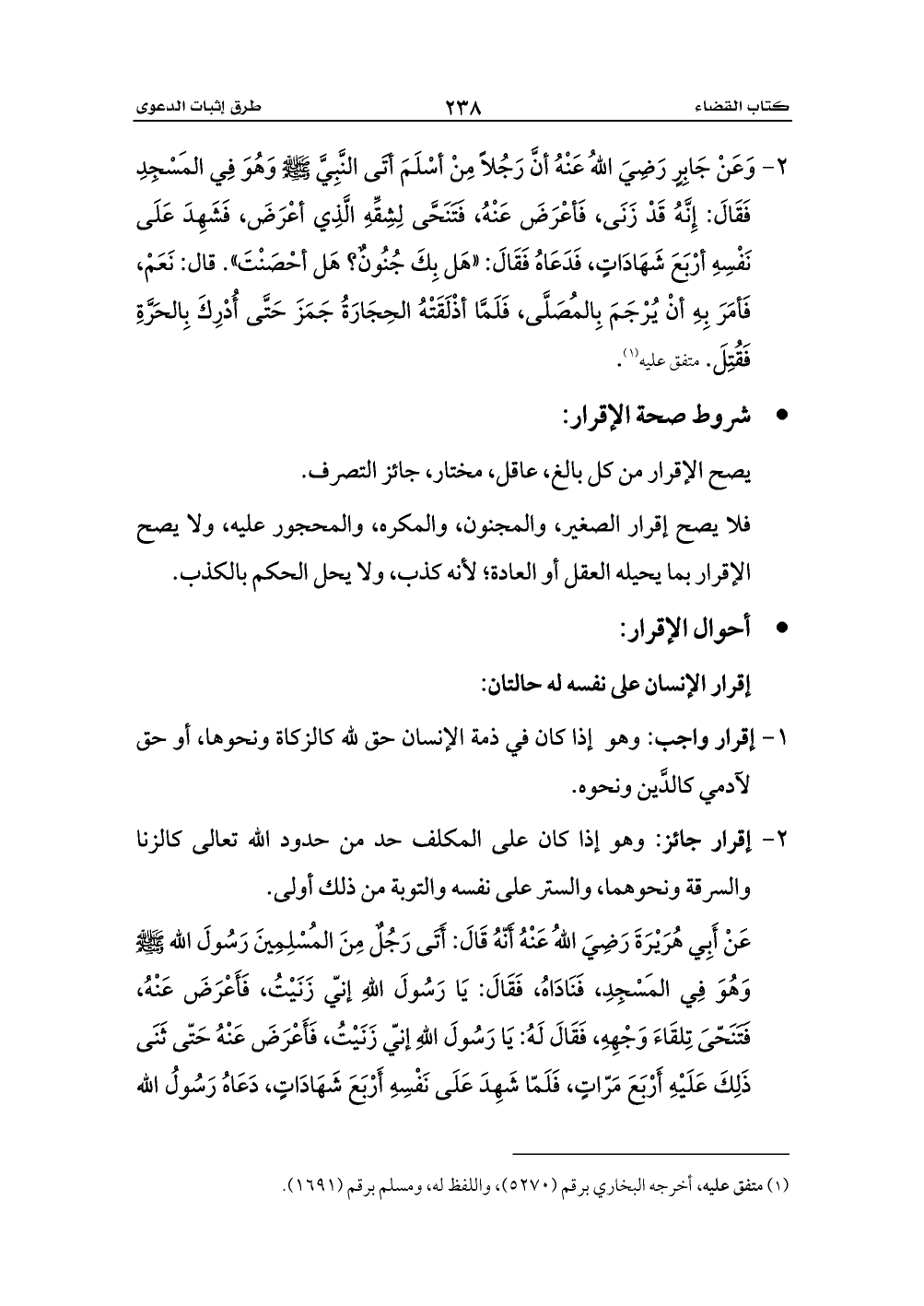 عَنْ أَبِي هُرَيْرَةَ رَضِيَ اللهُ عَنْهُ أَنّهُ قَالَ: أَتَى رَجُلٌ مِنَ المُسْلِمِينَ رَسُولَ الله - صلى الله عليه وسلم - وَهُوَ فِي المَسْجِدِ، فَنَادَاهُ، فَقَالَ: يَا رَسُولَ اللهِ إنّي زَنَيْتُ، فَأَعْرَضَ عَنْهُ، فَتَنَحّىَ تِلقَاءَ وَجْهِهِ، فَقَالَ لَهُ: يَا رَسُولَ اللهِ إنّي زَنَيْتُ، فَأَعْرَضَ عَنْهُ حَتّى ثَنَى ذَلِكَ عَلَيْهِ أَرْبَعَ مَرّاتٍ، فَلَمّا شَهِدَ عَلَى نَفْسِهِ أَرْبَعَ شَهَادَاتٍ، دَعَاهُ رَسُولُ الله