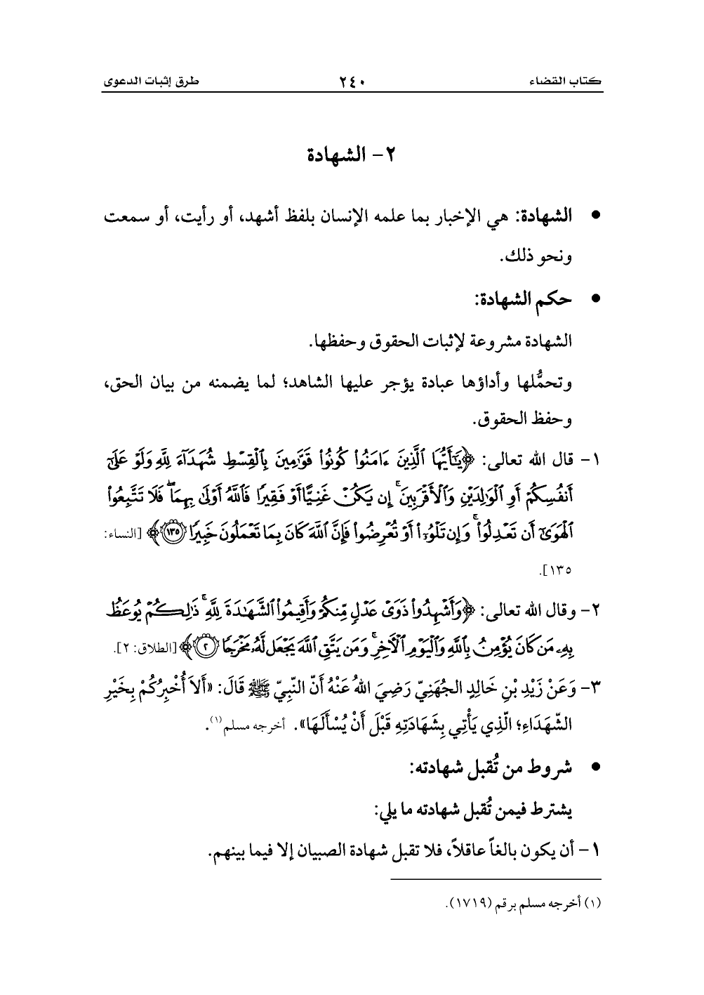 - الشهادة: هي الإخبار بما علمه الإنسان بلفظ أشهد، أو رأيت، أو سمعت ونحو ذلك.