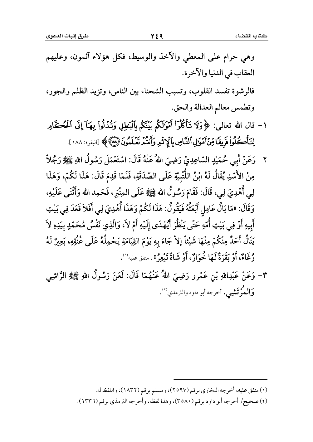 3 - وَعَنْ عَبْدِاللهِ بْنِ عَمْرو رَضِيَ اللهُ عَنْهُمَا قَالَ: لَعَنَ رَسُولُ اللهِ - صلى الله عليه وسلم - الرَّاشِي وَالمُرْتَشِي. أخرجه أبو داود والترمذي (¬2).