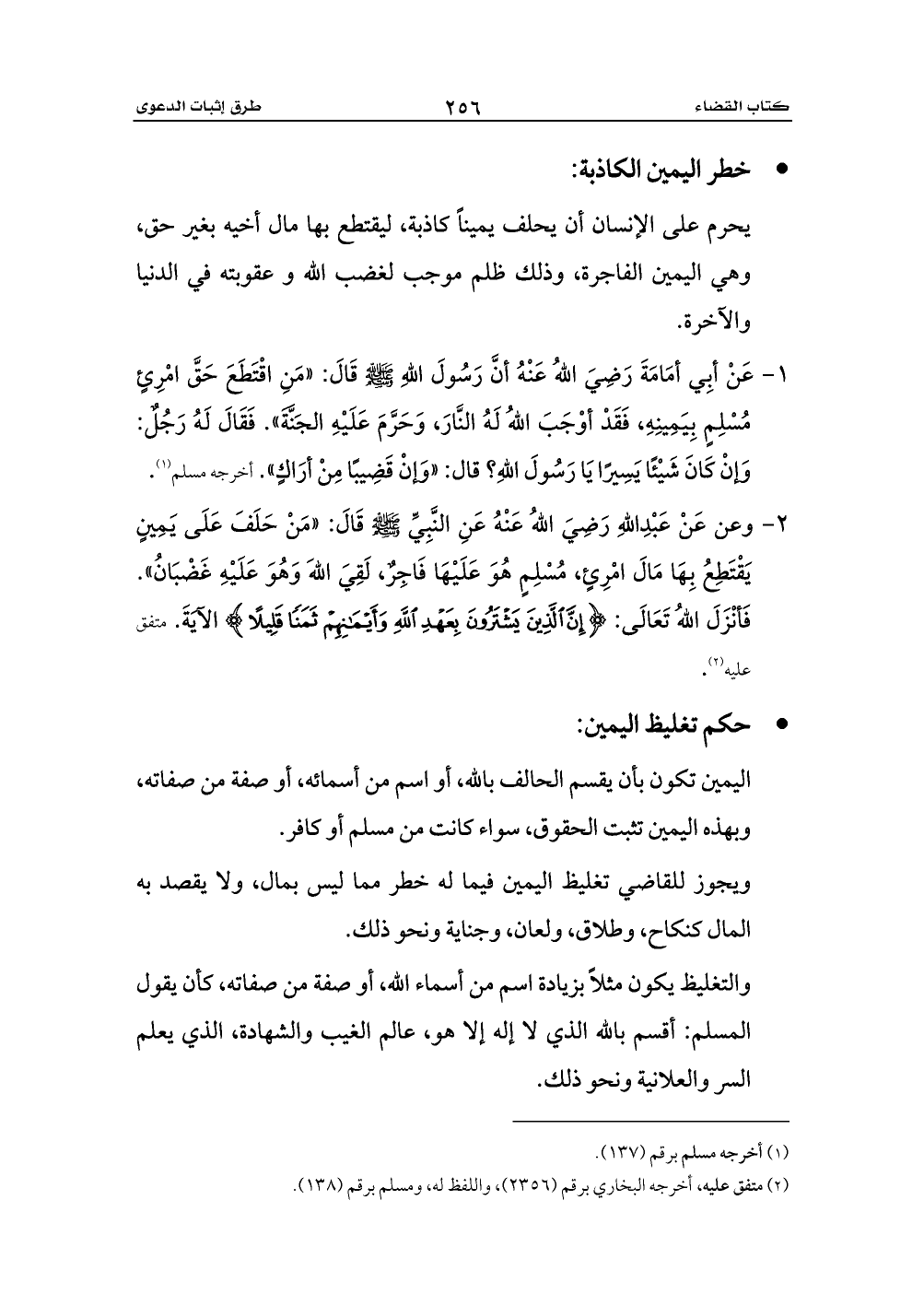 1 - عَنْ أبِي أمَامَةَ رَضِيَ اللهُ عَنْهُ أنَّ رَسُولَ اللهِ - صلى الله عليه وسلم - قَالَ: «مَنِ اقْتَطَعَ حَقَّ امْرِئٍ مُسْلِمٍ بِيَمِينِهِ، فَقَدْ أوْجَبَ اللهُ لَهُ النَّارَ، وَحَرَّمَ عَلَيْهِ الجَنَّةَ». فَقَالَ لَهُ رَجُلٌ: وَإنْ كَانَ شَيْئًا يَسِيرًا يَا رَسُولَ اللهِ؟ قال: «وَإنْ قَضِيبًا مِنْ أرَاكٍ». أخرجه مسلم (¬1).