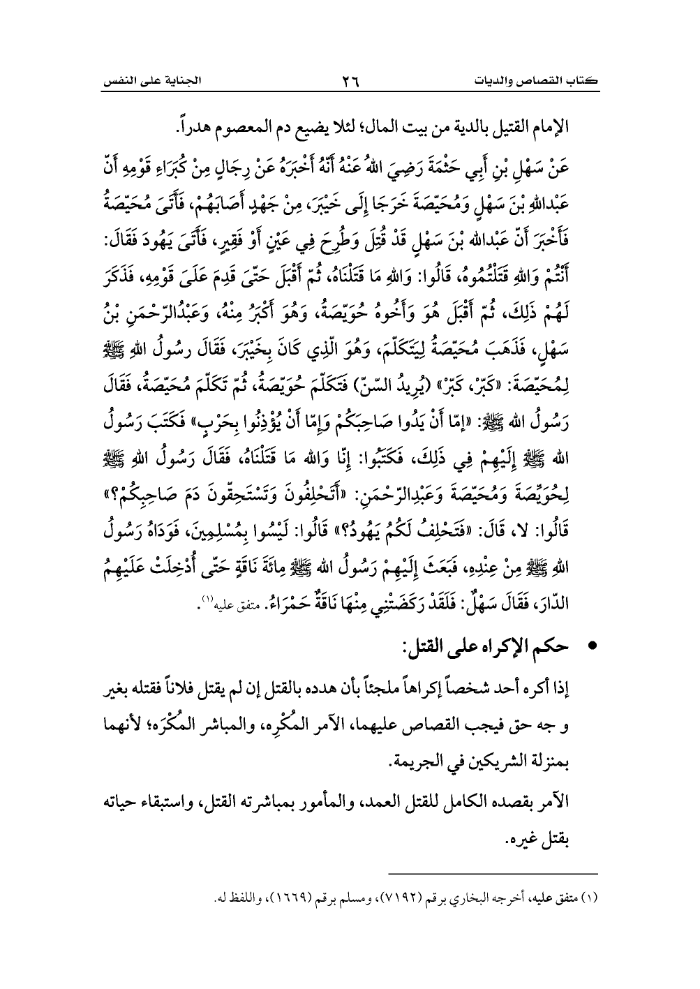 عَنْ سَهْلِ بْنِ أَبِي حَثْمَةَ رَضِيَ اللهُ عَنْهُ أَنّهُ أَخْبَرَهُ عَنْ رِجَالٍ مِنْ كُبَرَاءِ قَوْمِهِ أَنّ عَبْداللهِ بْنَ سَهْلٍ وَمُحَيّصَةَ خَرَجَا إِلَى خَيْبَرَ، مِنْ جَهْدٍ أَصَابَهُمْ، فَأَتَىَ مُحَيّصَةُ فَأَخْبَرَ أَنّ عَبْدالله بْنَ سَهْلٍ قَدْ قُتِلَ وَطُرِحَ فِي عَيْنٍ أَوْ فَقِيرٍ، فَأَتَىَ يَهُودَ فَقَالَ: أَنْتُمْ وَاللهِ قَتَلْتُمُوهُ، قَالُوا: وَاللهِ مَا قَتَلْنَاهُ، ثُمّ أَقْبَلَ حَتّىَ قَدِمَ عَلَىَ قَوْمِهِ، فَذَكَرَ لَهُمْ ذَلِكَ، ثُمّ أَقْبَلَ هُوَ وَأَخُوهُ حُوَيّصَةُ، وَهُوَ أَكْبَرُ مِنْهُ، وَعَبْدُالرّحْمَنِ بْنُ سَهْلٍ، فَذَهَبَ مُحَيّصَةُ لِيَتَكَلّمَ، وَهُوَ الّذِي كَانَ بِخَيْبَرَ، فَقَالَ رسُولُ اللهِ - صلى الله عليه وسلم - لِمُحَيّصَةَ: «كَبّرْ، كَبّرْ» (يُرِيدُ السّنّ) فَتَكَلّمَ حُوَيّصَةُ، ثُمّ تَكَلّمَ مُحَيّصَةُ، فَقَالَ رَسُولُ الله - صلى الله عليه وسلم -: «إمّا أَنْ يَدُوا صَاحِبَكُمْ وَإِمّا أَنْ يُؤْذِنُوا بِحَرْبٍ» فَكَتَبَ رَسُولُ الله - صلى الله عليه وسلم - إِلَيْهِمْ فِي ذَلِكَ، فَكَتَبُوا: إِنّا وَالله مَا قَتَلْنَاهُ، فَقَالَ رَسُولُ اللهِ - صلى الله عليه وسلم - لِحُوَيِّصَةَ وَمُحَيّصَةَ وَعَبْدِالرّحْمَنِ: «أَتَحْلِفُونَ وَتَسْتَحِقّونَ دَمَ صَاحِبِكُمْ؟» قَالُوا: لا، قَالَ: «فَتَحْلِفُ لَكُمُ يَهُودُ؟» قَالُوا: لَيْسُوا بِمُسْلِمِينَ، فَوَدَاهُ رَسُولُ اللهِ - صلى الله عليه وسلم - مِنْ عِنْدِهِ، فَبَعَثَ إِلَيْهِمْ رَسُولُ الله - صلى الله عليه وسلم - مِائَةَ نَاقَةٍ حَتّى أُدْخِلَتْ عَلَيْهِمُ الدّارَ، فَقَالَ سَهْلٌ: فَلَقَدْ رَكَضَتْنِي مِنْهَا نَاقَةٌ حَمْرَاءُ. متفق عليه (¬1).