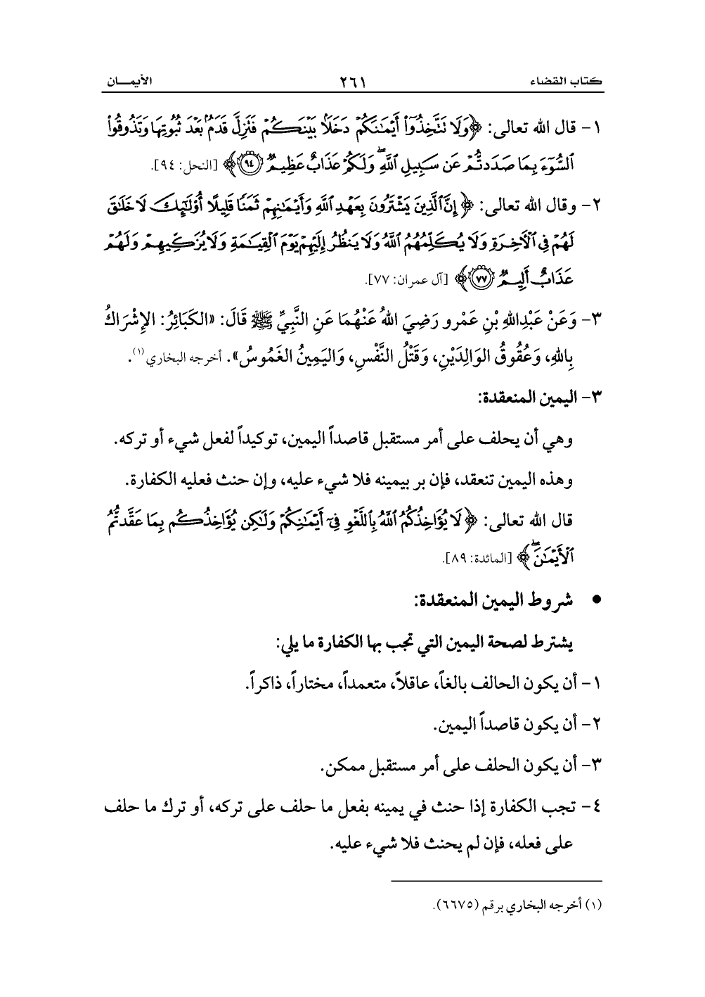 3 - وَعَنْ عَبْدِاللهِ بْنِ عَمْرو رَضِيَ اللهُ عَنْهُمَا عَنِ النَّبِيِّ - صلى الله عليه وسلم - قَالَ: «الكَبَائِرُ: الإِشْرَاكُ بِاللهِ، وَعُقُوقُ الوَالِدَيْنِ، وَقَتْلُ النَّفْسِ، وَاليَمِينُ الغَمُوسُ». أخرجه البخاري (¬1).