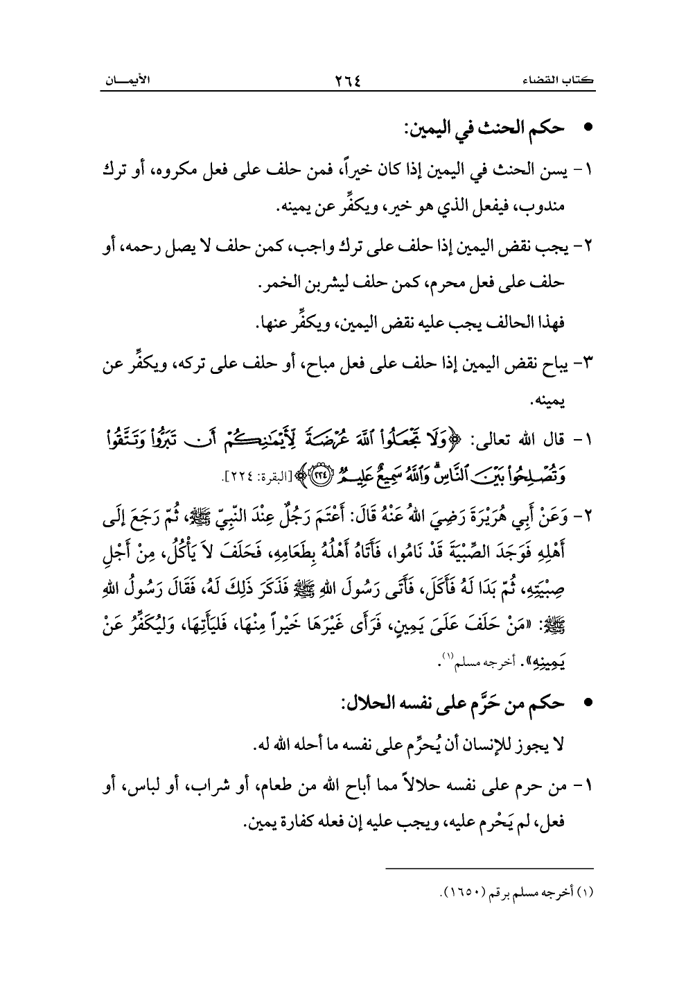 1 - من حرم على نفسه حلالاً مما أباح الله من طعام، أو شراب، أو لباس، أو فعل، لم يَحْرم عليه، ويجب عليه إن فعله كفارة يمين.