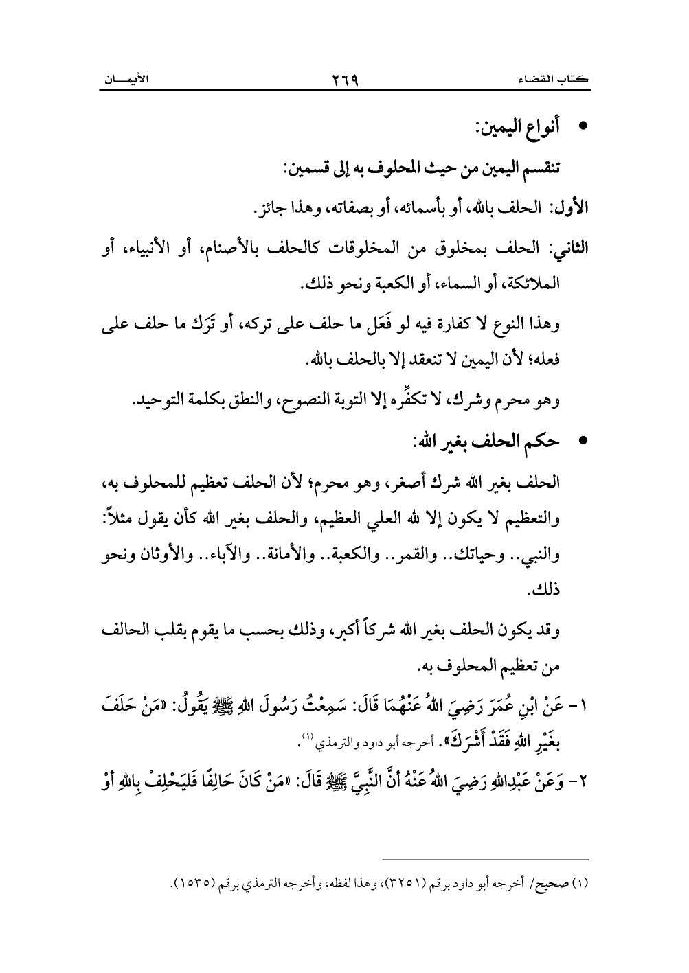 1 - عَنْ ابْنِ عُمَرَ رَضِيَ اللهُ عَنْهُمَا قَالَ: سَمِعْتُ رَسُولَ اللهِ - صلى الله عليه وسلم - يَقُولُ: «مَنْ حَلَفَ بغَيْرِ اللهِ فَقَدْ أَشْرَكَ». أخرجه أبو داود والترمذي (¬1).