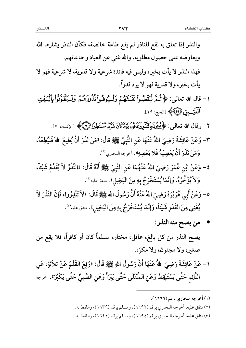 3 - وَعَنْ عَائِشَةَ رَضِيَ اللهُ عَنْهَا عَنِ النَّبِيِّ - صلى الله عليه وسلم - قالَ: «مَنْ نَذَرَ أنْ يُطِيعَ اللهَ فَليُطِعْهُ، وَمَنْ نَذَرَ أنْ يَعْصِيَهُ فَلا يَعْصِهِ». أخرجه البخاري (¬1).