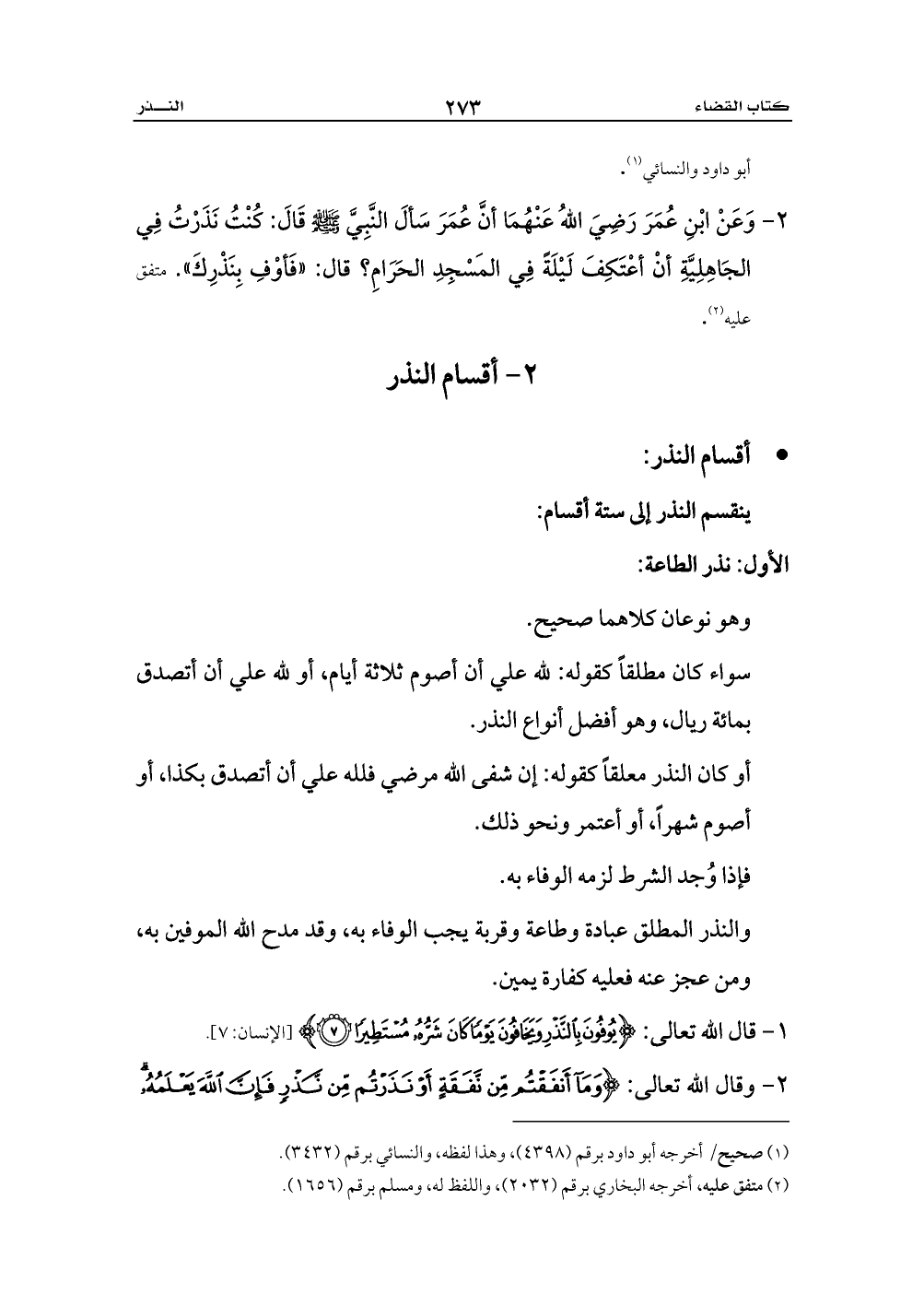 2 - وَعَنْ ابْنِ عُمَرَ رَضِيَ اللهُ عَنْهُمَا أنَّ عُمَرَ سَألَ النَّبِيَّ - صلى الله عليه وسلم - قَالَ: كُنْتُ نَذَرْتُ فِي الجَاهِلِيَّةِ أنْ أعْتَكِفَ لَيْلَةً فِي المَسْجِدِ الحَرَامِ؟ قال: «فَأوْفِ بِنَذْرِكَ». متفق عليه (¬2).