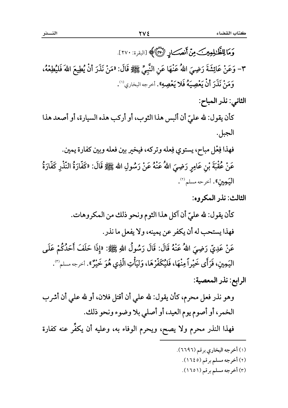 3 - وَعَنْ عَائِشَةَ رَضِيَ اللهُ عَنْهَا عَنِ النَّبِيِّ - صلى الله عليه وسلم - قَالَ: «مَنْ نَذَرَ أنْ يُطِيعَ اللهَ فَليُطِعْهُ، وَمَنْ نَذَرَ أنْ يَعْصِيَهُ فَلا يَعْصِهِ». أخرجه البخاري (¬1).