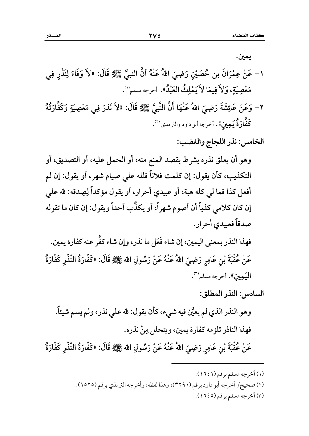 1 - عَنْ عِمْرَانَ بن حُصَيْنٍ رَضِيَ اللهُ عَنْهُ أنَّ النبيَّ - صلى الله عليه وسلم - قَالَ: «لاَ وَفَاءَ لِنَذْرٍ فِي مَعْصِيَةٍ، وَلاَ فِيمَا لاَ يَمْلِكُ العَبْدُ». أخرجه مسلم (¬1).