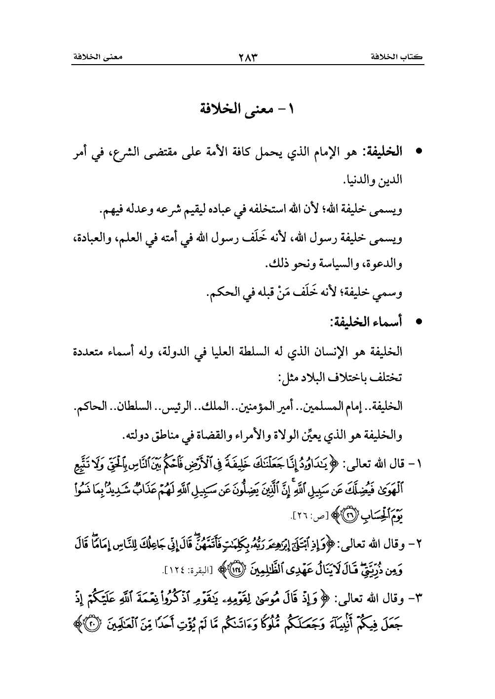 - الخليفة: هو الإمام الذي يحمل كافة الأمة على مقتضى الشرع، في أمر الدين والدنيا.