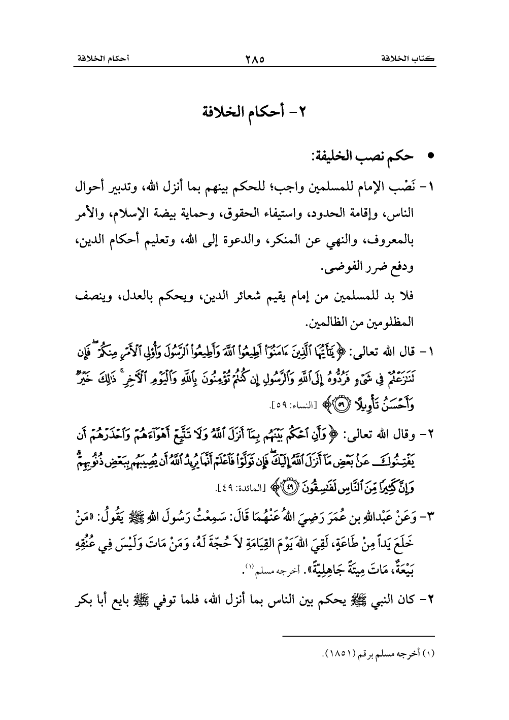 1 - نَصْب الإمام للمسلمين واجب؛ للحكم بينهم بما أنزل الله، وتدبير أحوال الناس، وإقامة الحدود، واستيفاء الحقوق، وحماية بيضة الإسلام، والأمر بالمعروف، والنهي عن المنكر، والدعوة إلى الله، وتعليم أحكام الدين، ودفع ضرر الفوضى.
