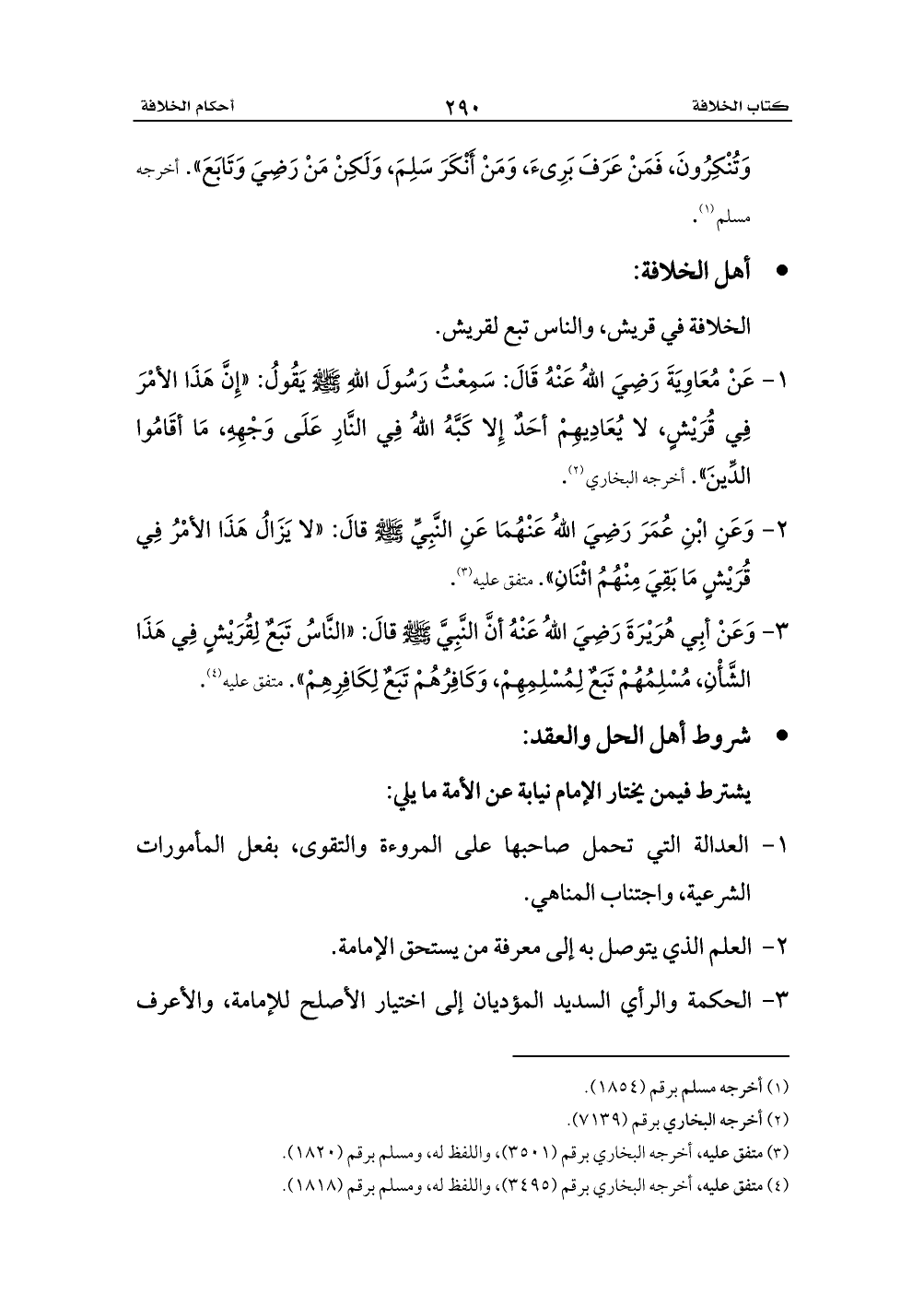 1 - عَنْ مُعَاوِيَةَ رَضِيَ اللهُ عَنْهُ قَالَ: سَمِعْتُ رَسُولَ اللهِ - صلى الله عليه وسلم - يَقُولُ: «إِنَّ هَذَا الأمْرَ فِي قُرَيْشٍ، لا يُعَادِيهِمْ أحَدٌ إِلا كَبَّهُ اللهُ فِي النَّارِ عَلَى وَجْهِهِ، مَا أقَامُوا الدِّينَ». أخرجه البخاري (¬2).