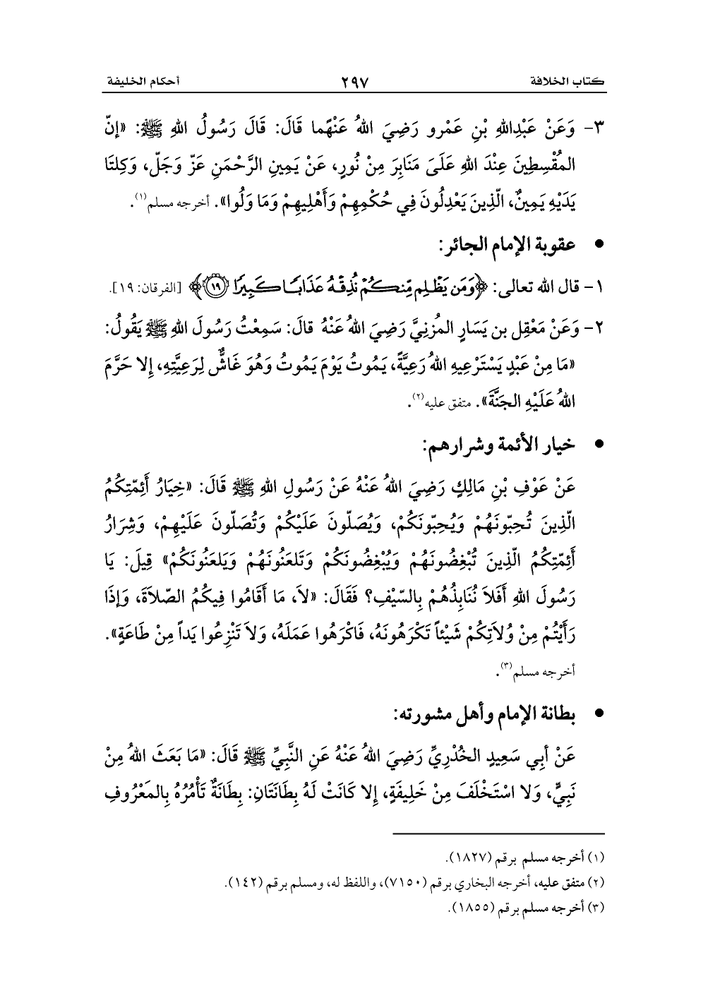 عَنْ عَوْفِ بْنِ مَالِكٍ رَضِيَ اللهُ عَنْهُ عَنْ رَسُولِ اللهِ - صلى الله عليه وسلم - قَالَ: «خِيَارُ أَئِمّتِكُمُ الّذِينَ تُحِبّونَهُمْ وَيُحِبّونَكُمْ، وَيُصَلّونَ عَلَيْكُمْ وَتُصَلّونَ عَلَيْهِمْ، وَشِرَارُ أَئِمّتِكُمُ الّذِينَ تُبْغِضُونَهُمْ وَيُبْغِضُونَكُمْ وَتَلعَنُونَهُمْ وَيَلعَنُونَكُمْ» قِيلَ: يَا رَسُولَ اللهِ أَفَلاَ نُنَابِذُهُمْ بِالسّيْفِ؟ فَقَالَ: «لاَ، مَا أَقَامُوا فِيكُمُ الصّلاَةَ، وَإذَا رَأَيْتُمْ مِنْ وُلاَتِكُمْ شَيْئاً تَكْرَهُونَهُ، فَاكْرَهُوا عَمَلَهُ، وَلاَ تَنْزِعُوا يَداً مِنْ طَاعَةٍ». أخرجه مسلم (¬3).