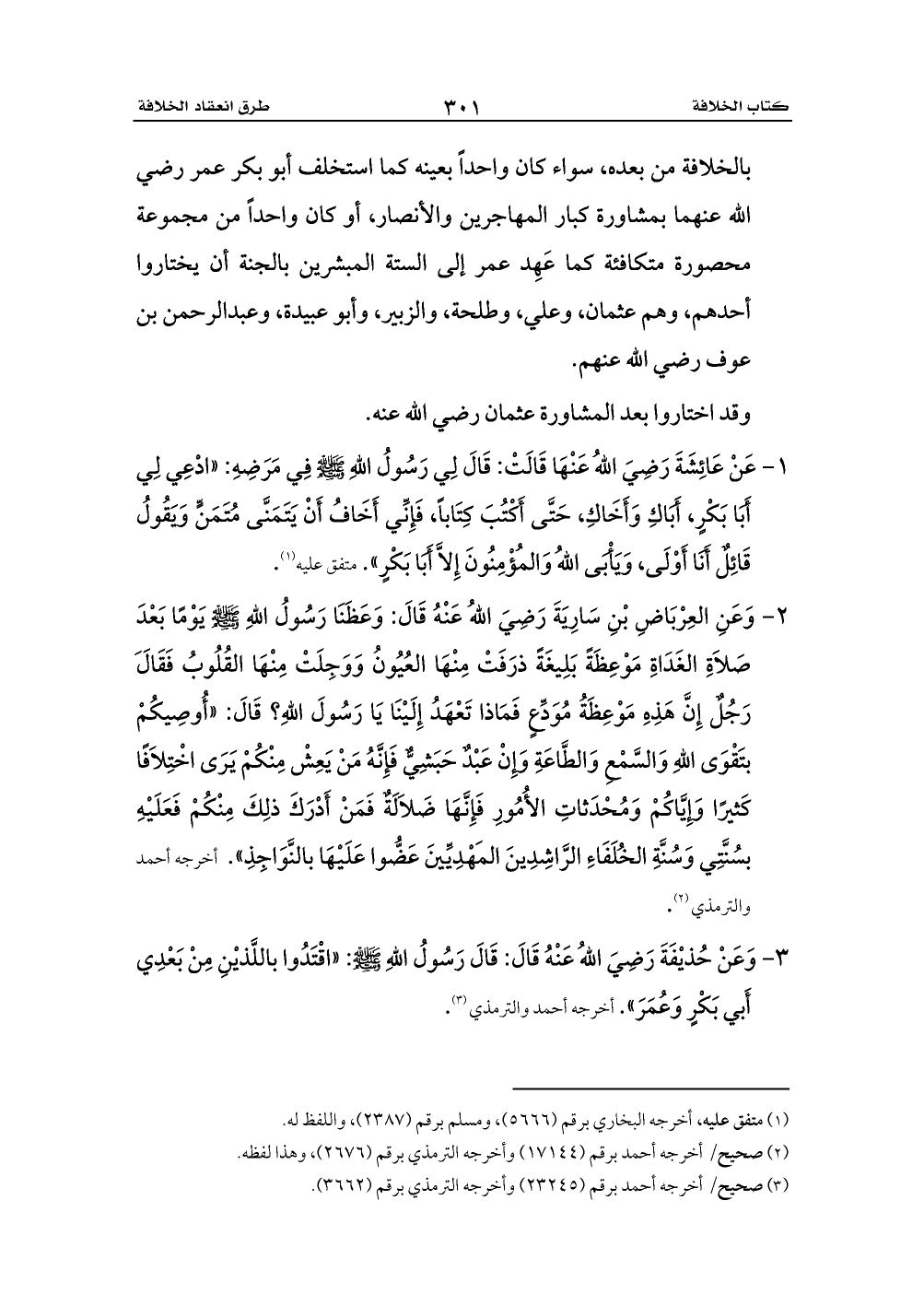 بالخلافة من بعده، سواء كان واحداً بعينه كما استخلف أبو بكر عمر رضي الله عنهما بمشاورة كبار المهاجرين والأنصار، أو كان واحداً من مجموعة محصورة متكافئة كما عَهِد عمر إلى الستة المبشرين بالجنة أن يختاروا أحدهم، وهم عثمان، وعلي، وطلحة، والزبير، وأبو عبيدة، وعبد الرحمن بن عوف رضي الله عنهم.
