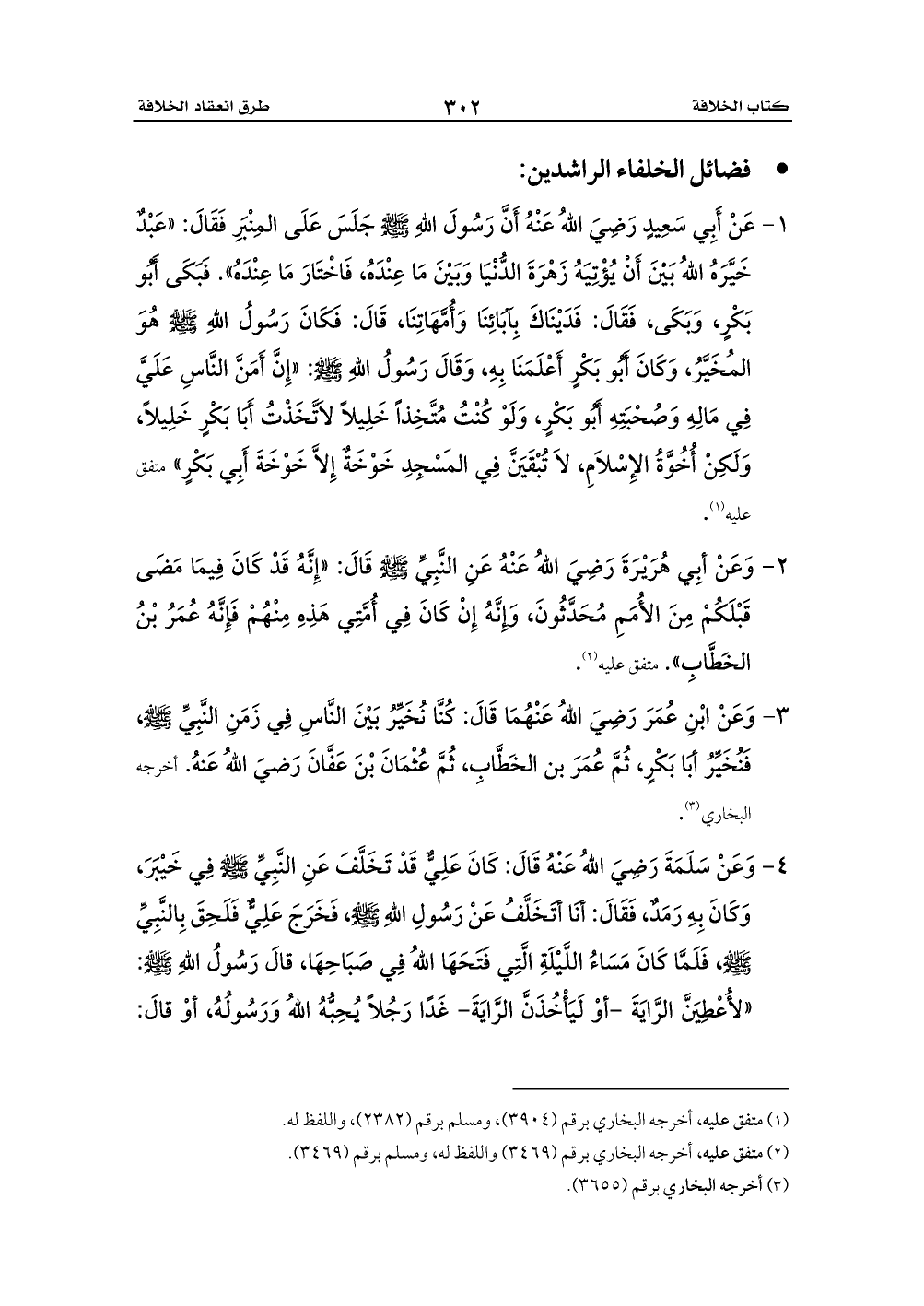3 - وَعَنْ ابْنِ عُمَرَ رَضِيَ اللهُ عَنْهُمَا قَالَ: كُنَّا نُخَيِّرُ بَيْنَ النَّاسِ فِي زَمَنِ النَّبِيِّ - صلى الله عليه وسلم -، فَنُخَيِّرُ أبَا بَكْرٍ، ثُمَّ عُمَرَ بن الخَطَّابِ، ثُمَّ عُثْمَانَ بْنَ عَفَّانَ رَضيَ اللهُ عَنهُ. أخرجه البخاري (¬3).