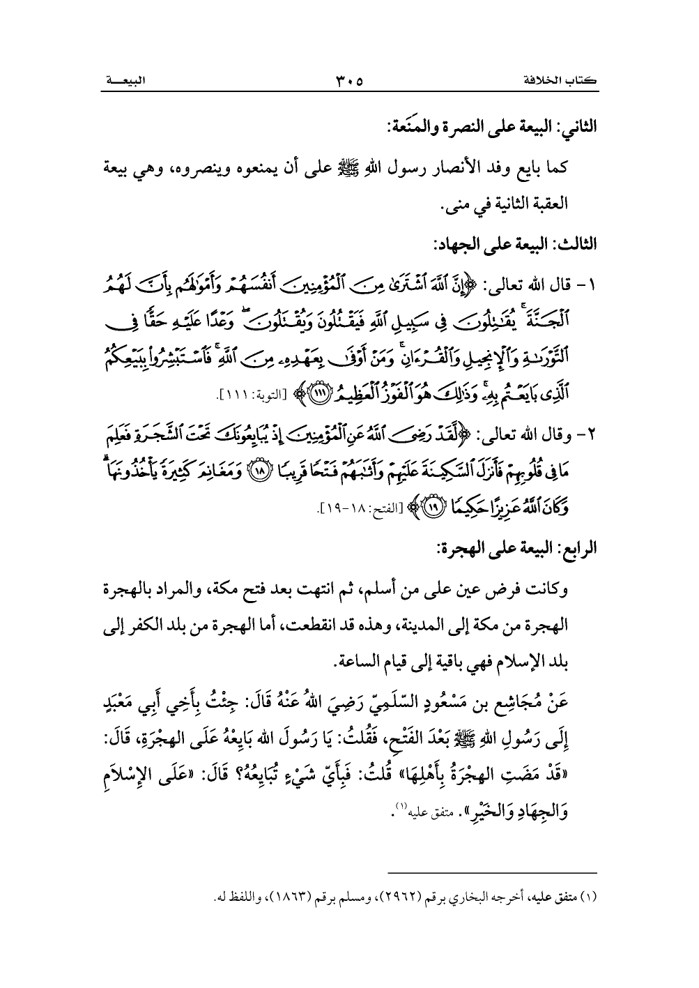 عَنْ مُجَاشِع بن مَسْعُودٍ السّلَمِيّ رَضِيَ اللهُ عَنْهُ قَالَ: جِئْتُ بِأَخِي أَبِي مَعْبَدٍ إِلَى رَسُولِ اللهِ - صلى الله عليه وسلم - بَعْدَ الفَتْحِ، فَقُلتُ: يَا رَسُولَ الله بَايِعْهُ عَلَى الهِجْرَةِ، قَالَ: «قَدْ مَضَتِ الهِجْرَةُ بِأَهْلِهَا» قُلتُ: فَبِأَيّ شَيْءٍ تُبَايِعُهُ؟ قَالَ: «عَلَى الإِسْلاَمِ