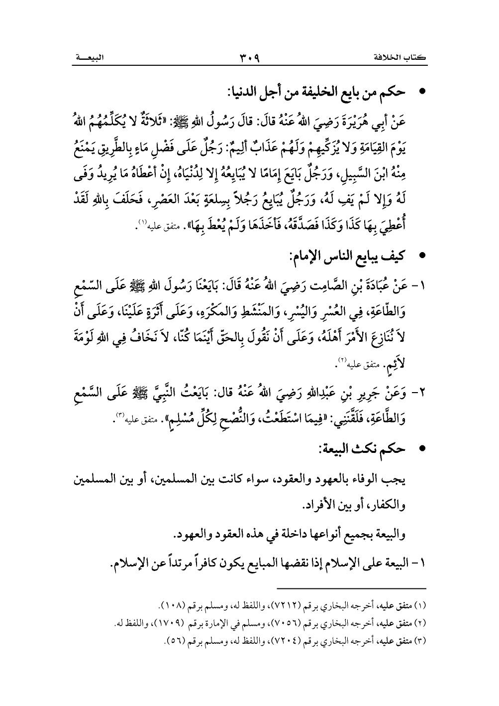 عَنْ أبِي هُرَيْرَةَ رَضِيَ اللهُ عَنْهُ قالَ: قالَ رَسُولُ اللهِ - صلى الله عليه وسلم -: «ثَلاثَةٌ لا يُكَلِّمُهُمُ اللهُ يَوْمَ القِيَامَةِ وَلا يُزَكِّيهِمْ وَلَهُمْ عَذَابٌ ألِيمٌ: رَجُلٌ عَلَى فَضْلِ مَاءٍ بِالطَّرِيقِ يَمْنَعُ مِنْهُ ابْنَ السَّبِيلِ، وَرَجُلٌ بَايَعَ إِمَامًا لا يُبَايِعُهُ إِلا لِدُنْيَاهُ، إِنْ أعْطَاهُ مَا يُرِيدُ وَفَى لَهُ وَإِلا لَمْ يَفِ لَهُ، وَرَجُلٌ يُبَايِعُ رَجُلاً بِسِلعَةٍ بَعْدَ العَصْرِ، فَحَلَفَ بِاللهِ لَقَدْ أُعْطِيَ بِهَا كَذَا وَكَذَا فَصَدَّقَهُ، فَأخَذَهَا وَلَمْ يُعْطَ بِهَا». متفق عليه (¬1).