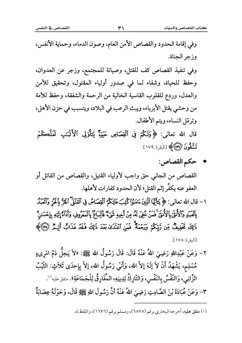 1 - قال الله تعالى: {يَاأَيُّهَا الَّذِينَ آمَنُوا كُتِبَ عَلَيْكُمُ الْقِصَاصُ فِي الْقَتْلَى الْحُرُّ بِالْحُرِّ وَالْعَبْدُ بِالْعَبْدِ وَالْأُنْثَى بِالْأُنْثَى فَمَنْ عُفِيَ لَهُ مِنْ أَخِيهِ شَيْءٌ فَاتِّبَاعٌ بِالْمَعْرُوفِ وَأَدَاءٌ إِلَيْهِ بِإِحْسَانٍ ذَلِكَ تَخْفِيفٌ مِنْ رَبِّكُمْ وَرَحْمَةٌ فَمَنِ اعْتَدَى بَعْدَ ذَلِكَ فَلَهُ عَذَابٌ أَلِيمٌ (178)} [البقرة: 178].