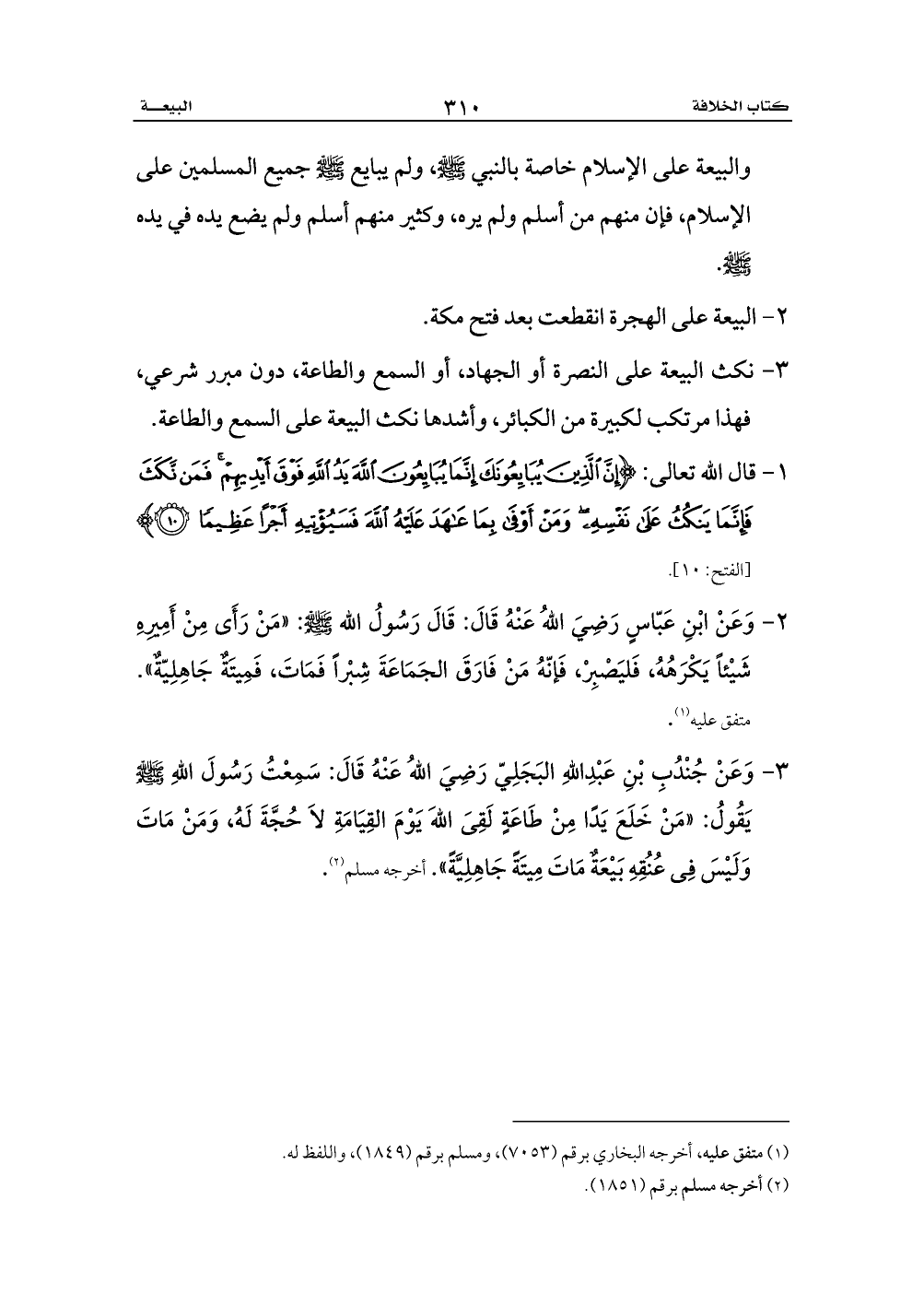 1 - قال الله تعالى: {إِنَّ الَّذِينَ يُبَايِعُونَكَ إِنَّمَا يُبَايِعُونَ اللَّهَ يَدُ اللَّهِ فَوْقَ أَيْدِيهِمْ فَمَنْ نَكَثَ فَإِنَّمَا يَنْكُثُ عَلَى نَفْسِهِ وَمَنْ أَوْفَى بِمَا عَاهَدَ عَلَيْهُ اللَّهَ فَسَيُؤْتِيهِ أَجْرًا عَظِيمًا (10)} [الفتح: 10].