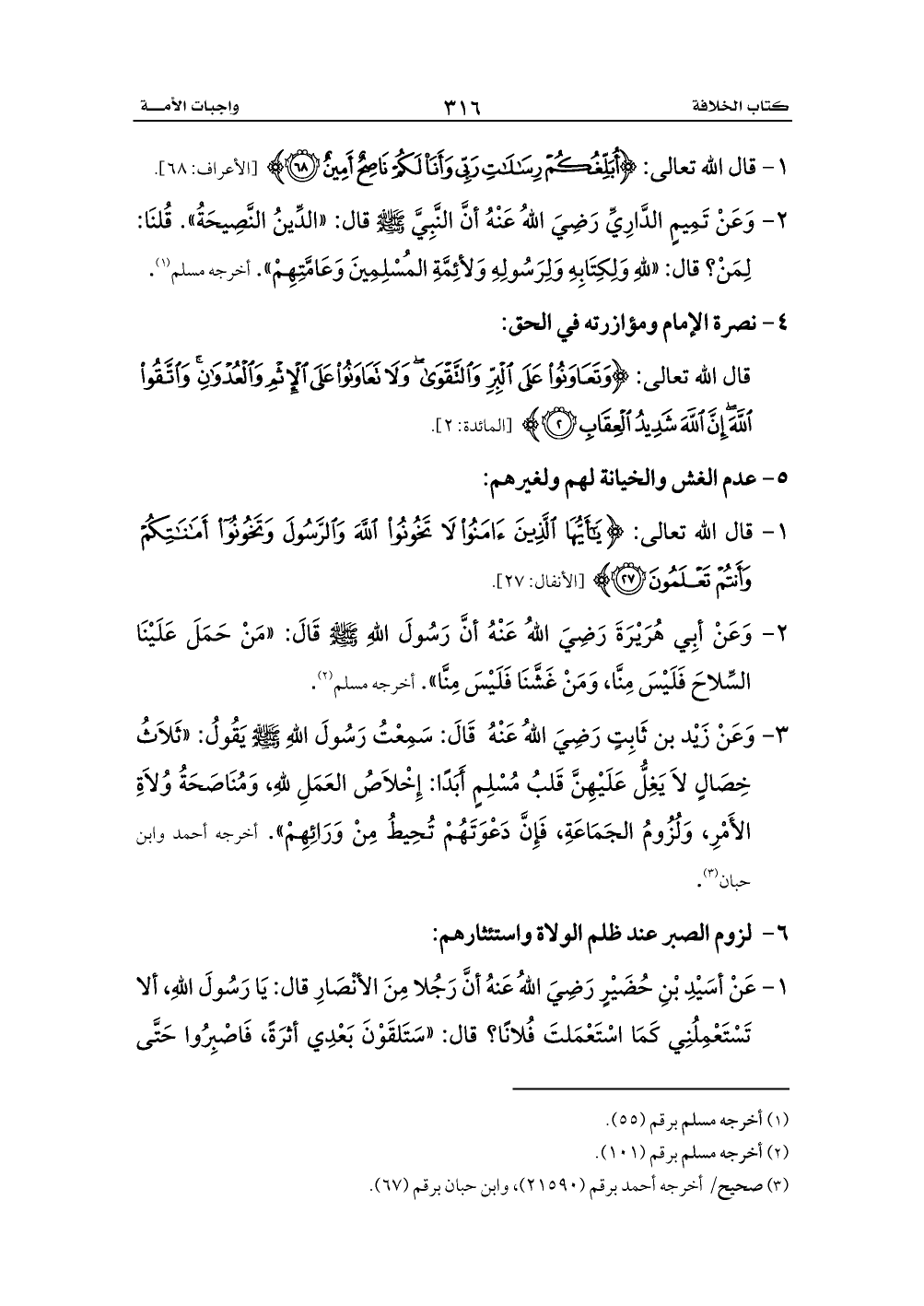 3 - وَعَنْ زَيْد بن ثَابِتٍ رَضِيَ اللهُ عَنْهُ قَالَ: سَمِعْتُ رَسُولَ اللهِ - صلى الله عليه وسلم - يَقُولُ: «ثَلاَثُ خِصَالٍ لاَ يَغِلُّ عَلَيْهِنَّ قَلبُ مُسْلِمٍ أَبَدًا: إِخْلاَصُ العَمَلِ للهِ، وَمُنَاصَحَةُ وُلاَةِ الأَمْرِ، وَلُزُومُ الجَمَاعَةِ، فَإِنَّ دَعْوَتَهُمْ تُحِيطُ مِنْ وَرَائِهِمْ». أخرجه أحمد وابن حبان (¬3).