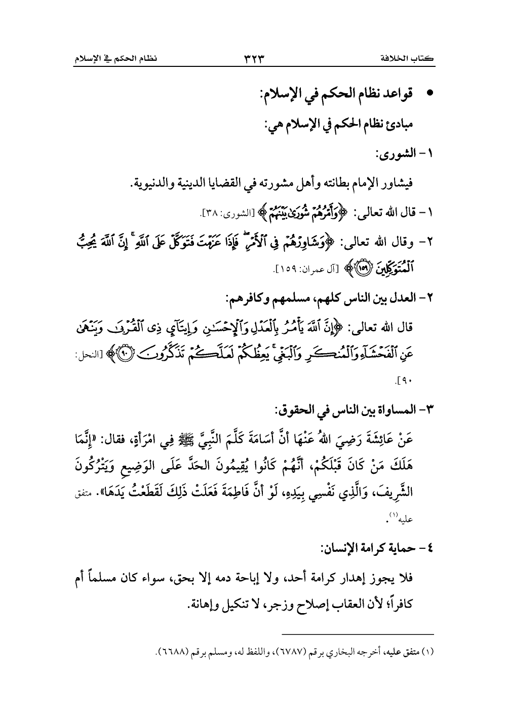 عَنْ عَائِشَةَ رَضِيَ اللهُ عَنْهَا أنَّ أسَامَةَ كَلَّمَ النَّبِيَّ - صلى الله عليه وسلم - فِي امْرَأةٍ، فقال: «إِنَّمَا هَلَكَ مَنْ كَانَ قَبْلَكُمْ، أنَّهُمْ كَانُوا يُقِيمُونَ الحَدَّ عَلَى الوَضِيعِ وَيَتْرُكُونَ الشَّرِيفَ، وَالَّذِي نَفْسِي بِيَدِهِ، لَوْ أنَّ فَاطِمَةَ فَعَلَتْ ذَلِكَ لَقَطَعْتُ يَدَهَا». متفق عليه (¬1).