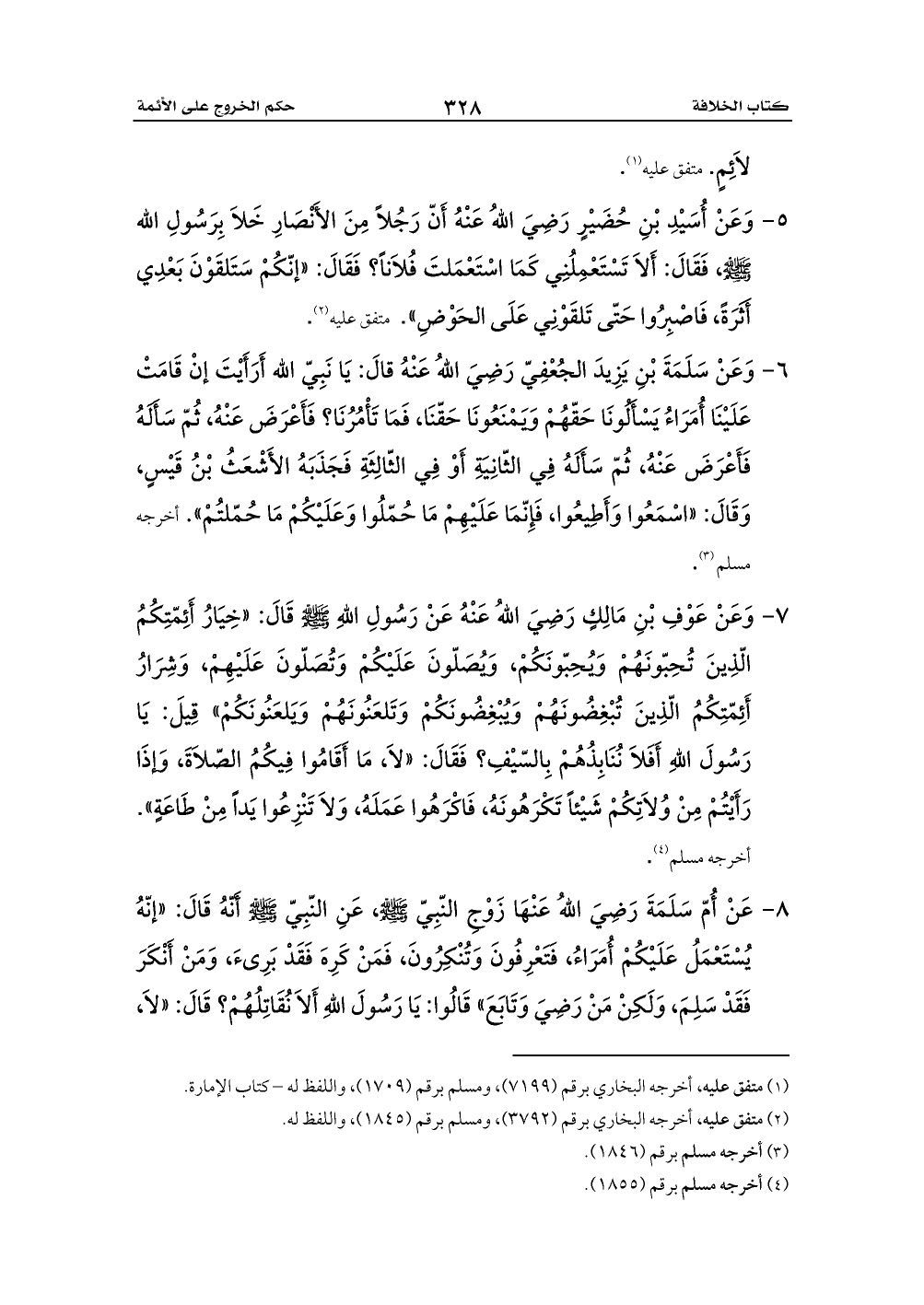 8 - عَنْ أُمّ سَلَمَةَ رَضِيَ اللهُ عَنْهَا زَوْجِ النّبِيّ - صلى الله عليه وسلم -، عَنِ النّبِيّ - صلى الله عليه وسلم - أَنّهُ قَالَ: «إنّهُ يُسْتَعْمَلُ عَلَيْكُمْ أُمَرَاءُ، فَتَعْرِفُونَ وَتُنْكِرُونَ، فَمَنْ كَرِهَ فَقَدْ بَرِىءَ، وَمَنْ أَنْكَرَ فَقَدْ سَلِمَ، وَلَكِنْ مَنْ رَضِيَ وَتَابَعَ» قَالُوا: يَا رَسُولَ اللهِ أَلاَ نُقَاتِلُهُمْ؟ قَالَ: «لاَ،