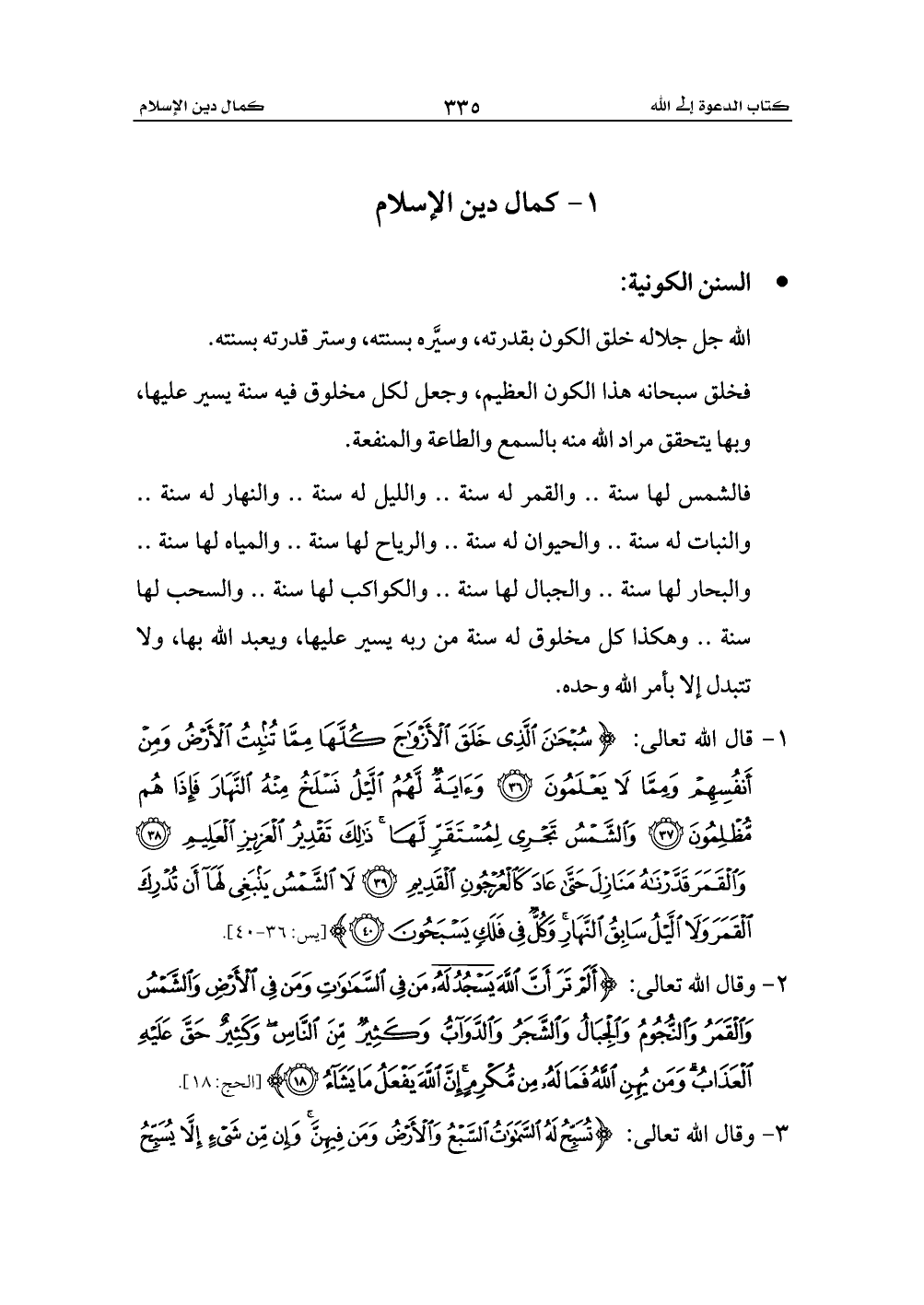 فالشمس لها سنة .. والقمر له سنة .. والليل له سنة .. والنهار له سنة .. والنبات له سنة .. والحيوان له سنة .. والرياح لها سنة .. والمياه لها سنة .. والبحار لها سنة .. والجبال لها سنة .. والكواكب لها سنة .. والسحب لها سنة .. وهكذا كل مخلوق له سنة من ربه يسير عليها، ويعبد الله بها، ولا تتبدل إلا بأمر الله وحده.