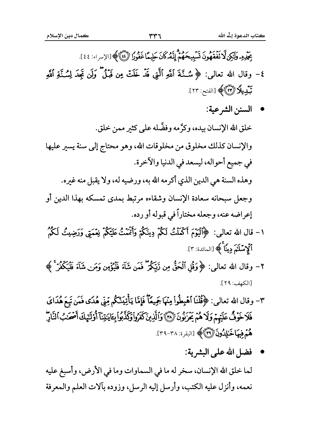 1 - قال الله تعالى: {الْيَوْمَ أَكْمَلْتُ لَكُمْ دِينَكُمْ وَأَتْمَمْتُ عَلَيْكُمْ نِعْمَتِي وَرَضِيتُ لَكُمُ الْإِسْلَامَ دِينًا} ... [المائدة: 3].