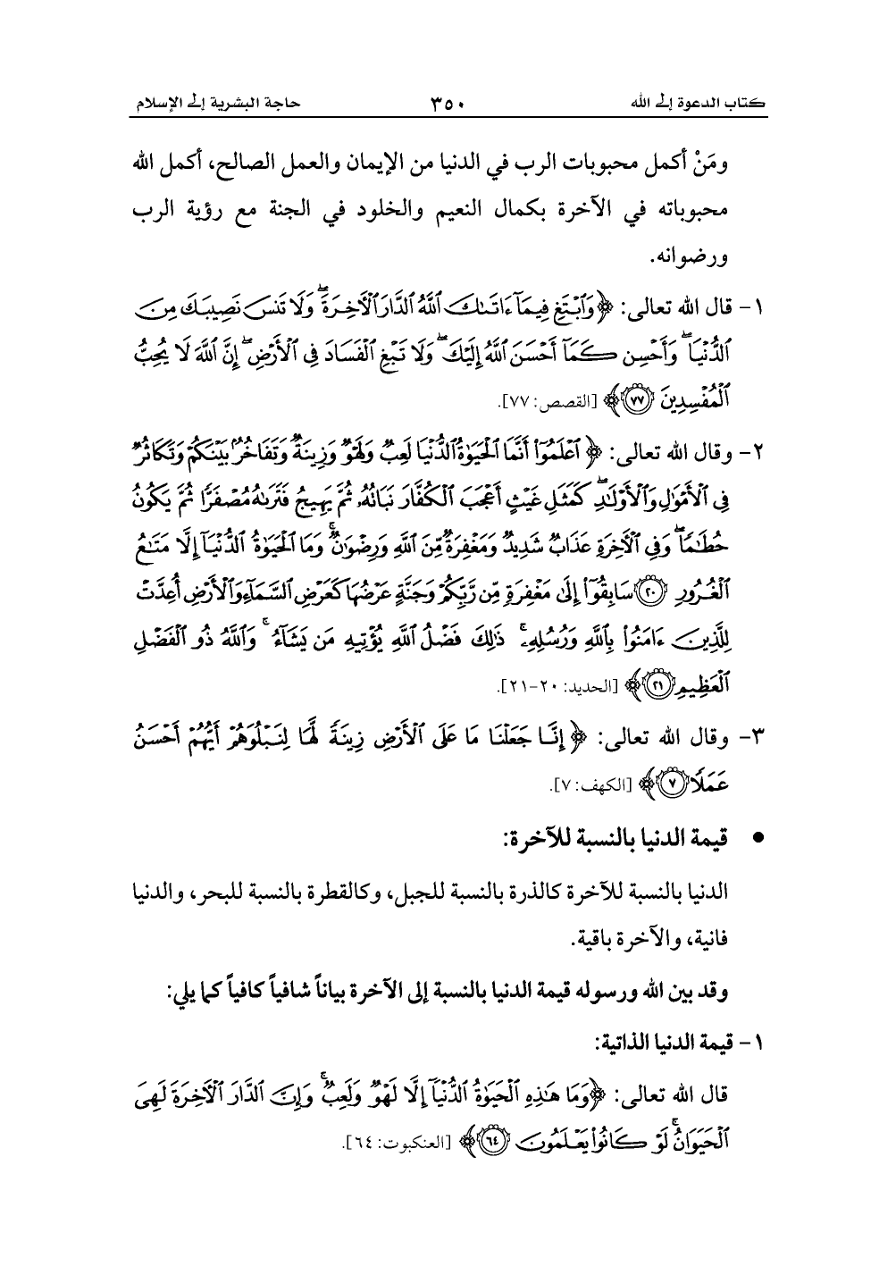 1 - قال الله تعالى: {وَابْتَغِ فِيمَا آتَاكَ اللَّهُ الدَّارَ الْآخِرَةَ وَلَا تَنْسَ نَصِيبَكَ مِنَ الدُّنْيَا وَأَحْسِنْ كَمَا أَحْسَنَ اللَّهُ إِلَيْكَ وَلَا تَبْغِ الْفَسَادَ فِي الْأَرْضِ إِنَّ اللَّهَ لَا يُحِبُّ الْمُفْسِدِينَ (77)} [القصص: 77].