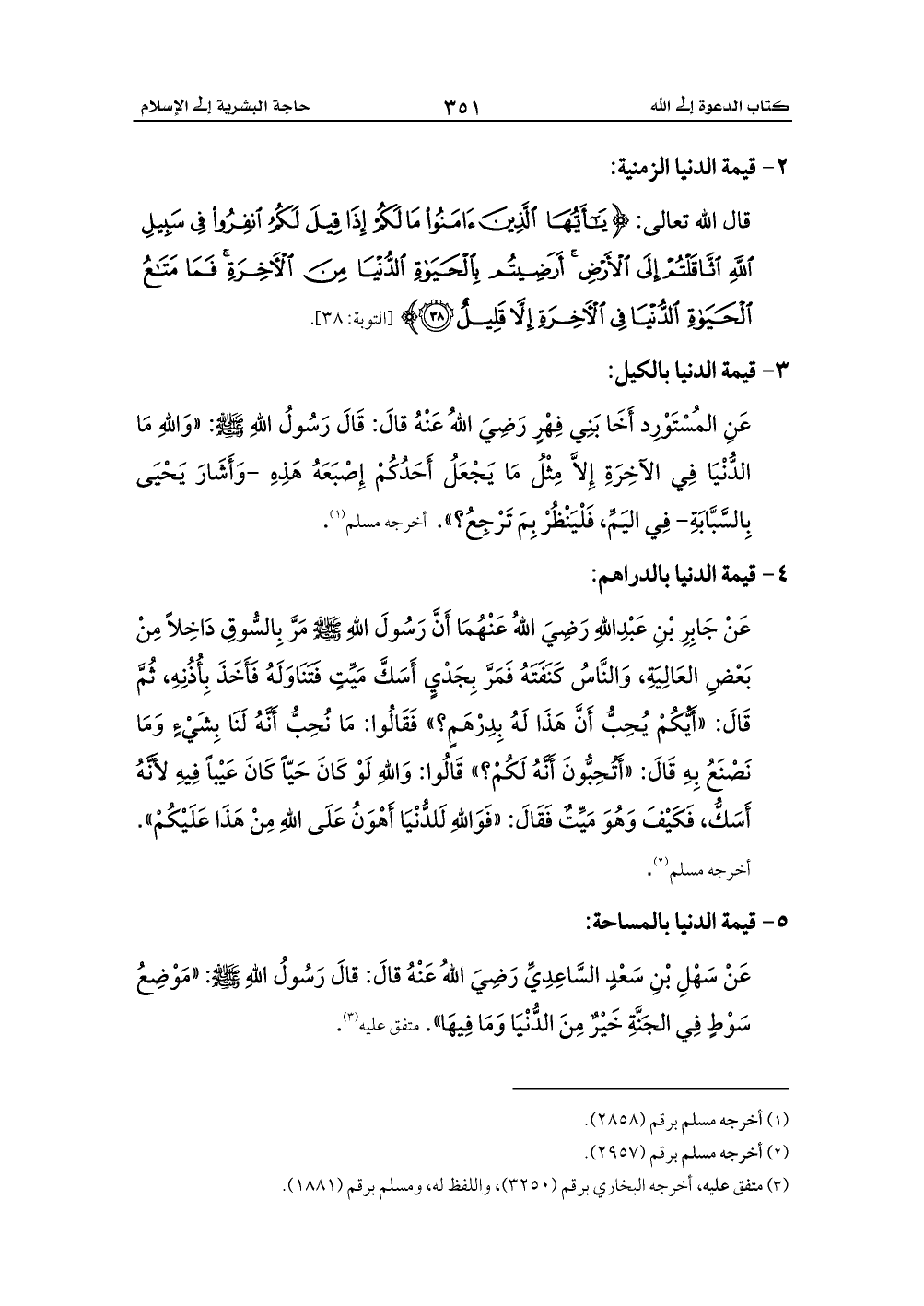 عَنْ جَابِرِ بْنِ عَبْدِاللهِ رَضِيَ اللهُ عَنْهُمَا أَنَّ رَسُولَ اللهِ - صلى الله عليه وسلم - مَرَّ بِالسُّوقِ دَاخِلاً مِنْ بَعْضِ العَالِيَةِ، وَالنَّاسُ كَنَفَتَهُ فَمَرَّ بِجَدْيٍ أَسَكَّ مَيِّتٍ فَتَنَاوَلَهُ فَأَخَذَ بِأُذُنِهِ، ثُمَّ قَالَ: «أَيُّكُمْ يُحِبُّ أَنَّ هَذَا لَهُ بِدِرْهَمٍ؟» فَقَالُوا: مَا نُحِبُّ أَنَّهُ لَنَا بِشَيْءٍ وَمَا نَصْنَعُ بِهِ قَالَ: «أَتُحِبُّونَ أَنَّهُ لَكُمْ؟» قَالُوا: وَاللهِ لَوْ كَانَ حَيّاً كَانَ عَيْباً فِيهِ لأَنَّهُ أَسَكُّ، فَكَيْفَ وَهُوَ مَيِّتٌ فَقَالَ: «فَوَاللهِ لَلدُّنْيَا أَهْوَنُ عَلَى اللهِ مِنْ هَذَا عَلَيْكُمْ». أخرجه مسلم (¬2).