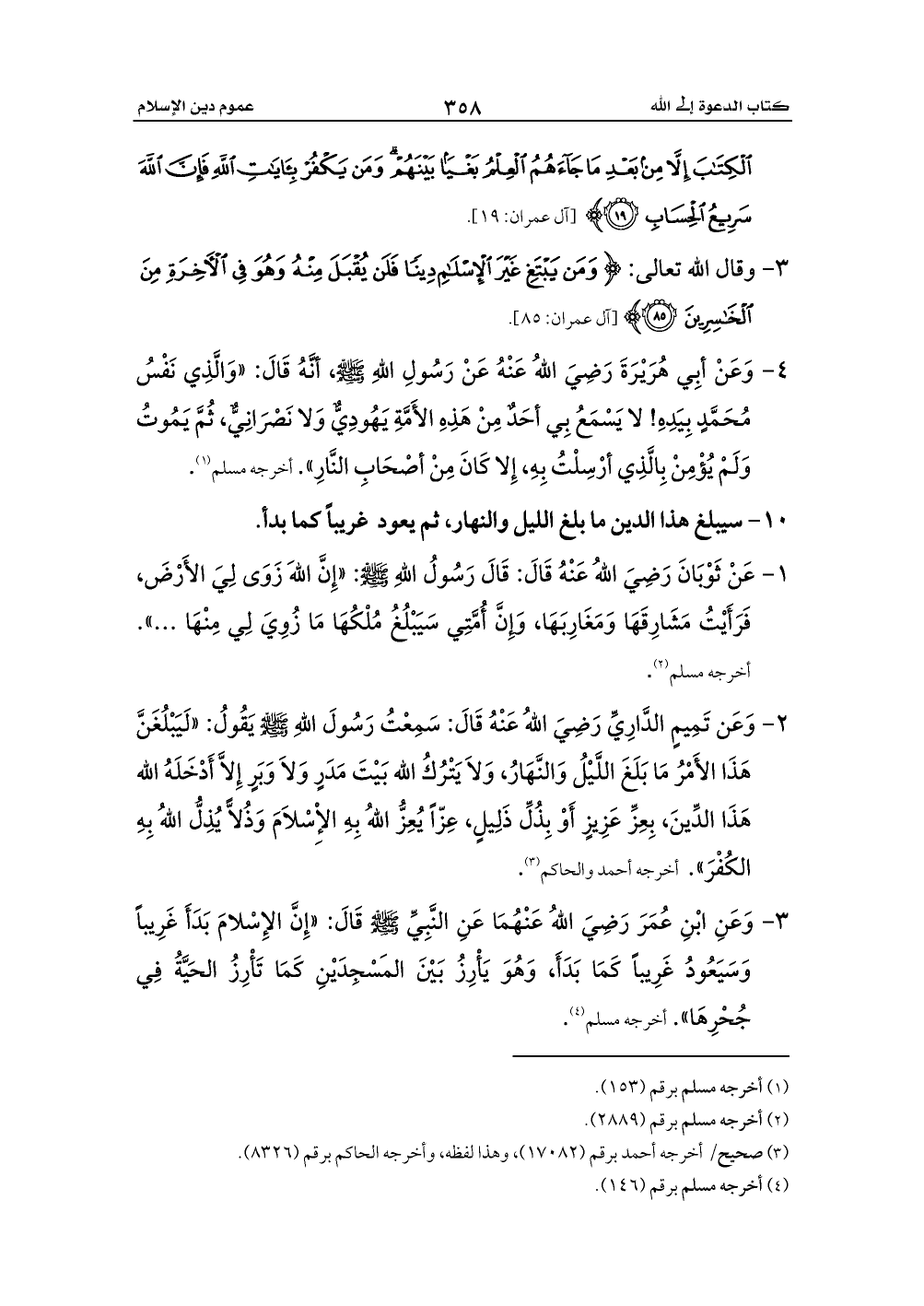 2 - وَعَن تَمِيمٍ الدَّارِيِّ رَضِيَ اللهُ عَنْهُ قَالَ: سَمِعْتُ رَسُولَ اللهِ - صلى الله عليه وسلم - يَقُولُ: «لَيَبْلُغَنَّ هَذَا الأَمْرُ مَا بَلَغَ اللَّيْلُ وَالنَّهَارُ، وَلاَ يَتْرُكُ الله بَيْتَ مَدَرٍ وَلاَ وَبَرٍ إِلاَّ أَدْخَلَهُ الله هَذَا الدِّينَ، بِعِزِّ عَزِيزٍ أَوْ بِذُلِّ ذَلِيلٍ، عِزّاً يُعِزُّ اللهُ بِهِ الإِْسْلاَمَ وَذُلاًّ يُذِلُّ اللهُ بِهِ الكُفْرَ». أخرجه أحمد والحاكم (¬3).