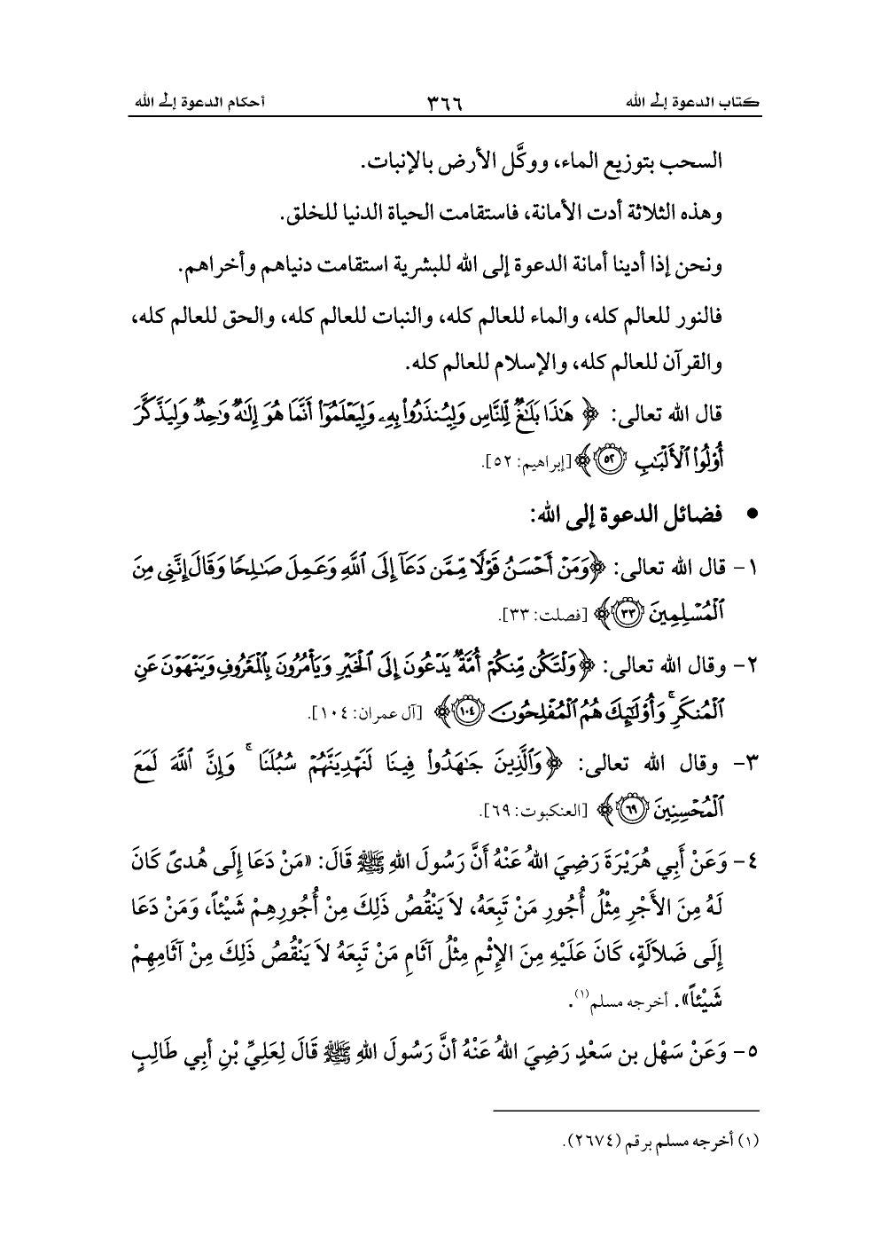1 - قال الله تعالى: {وَمَنْ أَحْسَنُ قَوْلًا مِمَّنْ دَعَا إِلَى اللَّهِ وَعَمِلَ صَالِحًا وَقَالَ إِنَّنِي مِنَ الْمُسْلِمِينَ (33)} [فصلت: 33].