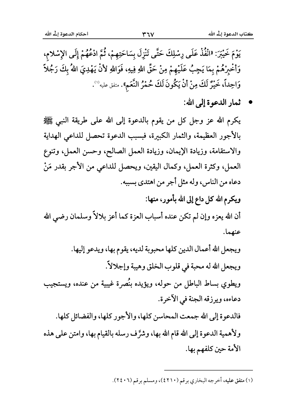 يَوْمَ خَيْبَرَ: «انْفُذْ عَلَى رِسْلِكَ حَتَّى تَنْزِلَ بِسَاحَتِهِمْ، ثُمَّ ادْعُهُمْ إِلَى الإِسْلامِ، وَأخْبِرْهُمْ بِمَا يَجِبُ عَلَيْهِمْ مِنْ حَقِّ اللهِ فِيهِ، فَوَاللهِ لأنْ يَهْدِيَ اللهُ بِكَ رَجُلاً وَاحِداً، خَيْرٌ لَكَ مِنْ أنْ يَكُونَ لَكَ حُمْرُ النَّعَمِ». متفق عليه (¬1).