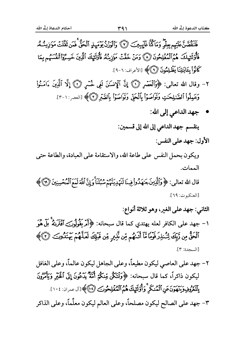 2 - جهد على العاصي ليكون مطيعاً، وعلى الجاهل ليكون عالماً، وعلى الغافل ليكون ذاكراً، كما قال سبحانه: {وَلْتَكُنْ مِنْكُمْ أُمَّةٌ يَدْعُونَ إِلَى الْخَيْرِ وَيَأْمُرُونَ بِالْمَعْرُوفِ وَيَنْهَوْنَ عَنِ الْمُنْكَرِ وَأُولَئِكَ هُمُ الْمُفْلِحُونَ (104)} [آل عمران: 104].