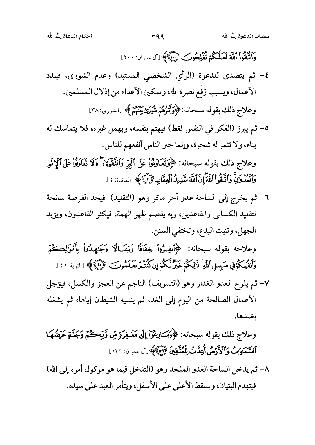 4 - ثم يتصدى للدعوة (الرأي الشخصي المستبد) وعدم الشورى، فيبدد الأعمال، ويسبب رَفْع نصرة الله، وتمكين الأعداء من إذلال المسلمين.