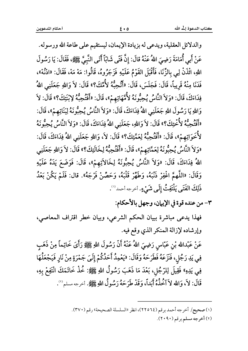 عَنْ أَبي أُمَامَةَ رَضِيَ اللهُ عَنْهُ قالَ: إِنَّ فَتًى شَابّاً أَتَى النَّبِيَّ - صلى الله عليه وسلم -، فَقَالَ: يَا رَسُولَ اللهِ، ائْذَنْ لِي بِالزِّنَا، فَأَقْبَلَ القَوْمُ عَلَيْهِ فَزَجَرُوهُ، قَالُوا: مَهْ مَهْ، فَقَالَ: «ادْنُهْ»، فَدَنَا مِنْهُ قَرِيباً، قَالَ: فَجَلَسَ، قَالَ: «أَتُحِبُّهُ لأُمِّكَ؟» قَالَ: لاَ وَاللهِ جَعَلَنِي اللهُ فِدَاءَكَ، قَالَ: «وَلاَ النَّاسُ يُحِبُّونَهُ لأُمَّهَاتِهِمْ»، قَالَ: «أَفَتُحِبُّهُ لاِبْنَتِكَ؟» قَالَ: لاَ وَاللهِ يَا رَسُولَ اللهِ جَعَلَنِي اللهُ فِدَاءَكَ، قَالَ: «وَلاَ النَّاسُ يُحِبُّونَهُ لِبَنَاتِهِمْ»، قَالَ: «أَفَتُحِبُّهُ لأُخْتِكَ؟» قَالَ: لاَ وَاللهِ، جَعَلَنِي اللهُ فِدَاءَكَ، قَالَ: «وَلاَ النَّاسُ يُحِبُّونَهُ لأُخَوَاتِهِمْ»، قَالَ: «أَفَتُحِبُّهُ لِعَمَّتِكَ؟» قَالَ: لاَ، وَاللهِ جَعَلَنِي اللهُ فِدَاءَكَ، قَالَ: «وَلاَ النَّاسُ يُحِبُّونَهُ لِعَمَّاتِهِمْ»، قَالَ: «أَفَتُحِبُّهُ لِخَالَتِكَ؟» قَالَ: لاَ وَاللهِ جَعَلَنِي اللهُ فِدَاءَكَ، قَالَ: «وَلاَ النَّاسُ يُحِبُّونَهُ لِخَالاَتِهِمْ»، قَالَ: فَوَضَعَ يَدَهُ عَلَيْهِ وَقَالَ: «اللَّهمَّ اغْفِرْ ذَنْبَهُ، وَطَهِّرْ قَلْبَهُ، وَحَصِّنْ فَرْجَهُ». قال: فَلَمْ يَكُنْ بَعْدُ ذَلِكَ الفَتَى يَلْتَفِتُ إِلَى شَيْءٍ. أخرجه أحمد (¬1).