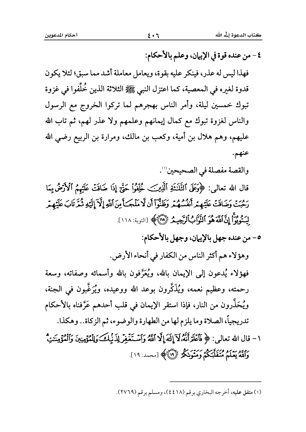 فهذا ليس له عذر، فينكر عليه بقوة، ويعامل معاملة أشد مما سبق؛ لئلا يكون قدوة لغيره في المعصية، كما اعتزل النبي - صلى الله عليه وسلم - الثلاثة الذين خُلِّفوا في غزوة تبوك خمسين ليلة، وأمر الناس بهجرهم لما تركوا الخروج مع الرسول والناس لغزوة تبوك مع كمال إيمانهم وعلمهم ولا عذر لهم، ثم تاب الله عليهم، وهم هلال بن أمية، وكعب بن مالك، ومرارة بن الربيع رضي الله عنهم.