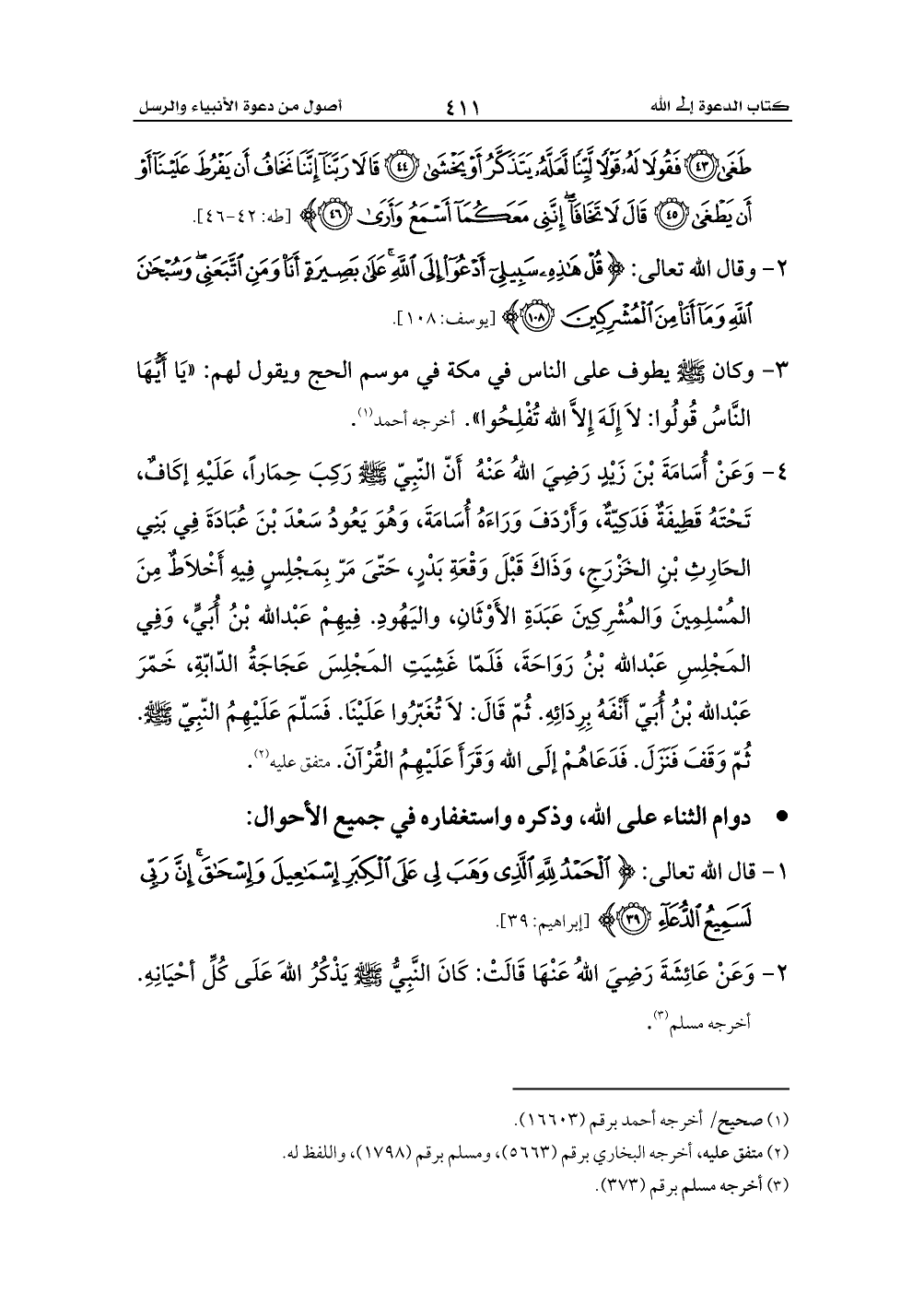 3 - وكان - صلى الله عليه وسلم - يطوف على الناس في مكة في موسم الحج ويقول لهم: «يَا أَيُّهَا النَّاسُ قُولُوا: لاَ إِلَهَ إِلاَّ الله تُفْلِحُوا». أخرجه أحمد (¬1).
