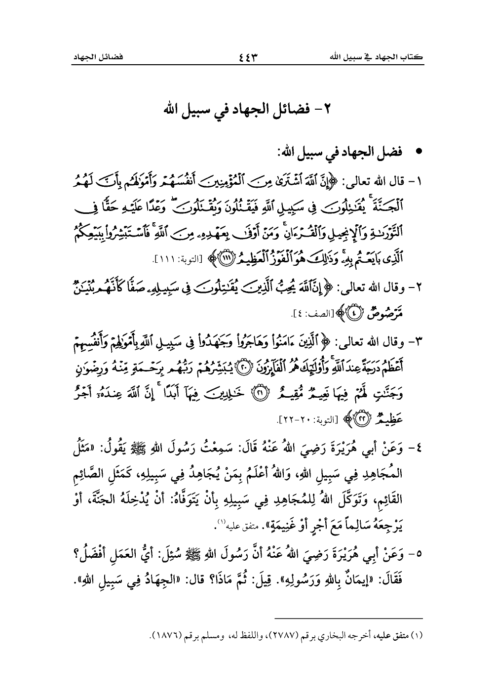 5 - وَعَنْ أبِي هُرَيْرَةَ رَضِيَ اللهُ عَنْهُ أنَّ رَسُولَ اللهِ - صلى الله عليه وسلم - سُئِلَ: أيُّ العَمَلِ أفْضَلُ؟ فَقَالَ: «إيمَانٌ بِاللهِ وَرَسُولِهِ». قِيلَ: ثُمَّ مَاذَا؟ قال: «الجِهَادُ فِي سَبِيلِ اللهِ».