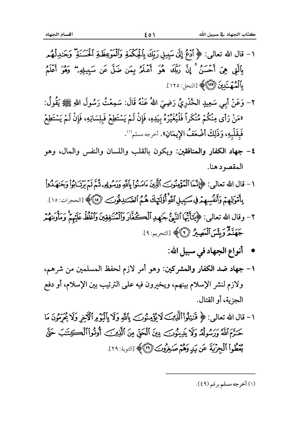 4 - جهاد الكفار والمنافقين: ويكون بالقلب واللسان والنفس والمال، وهو المقصود هنا.