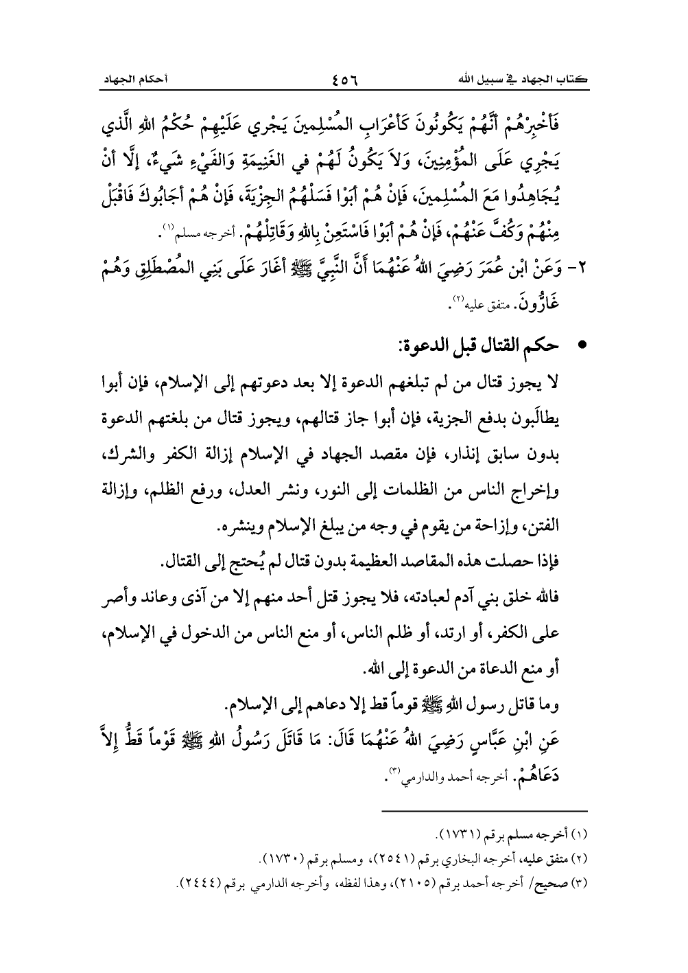 عَنِ ابْنِ عَبَّاسٍ رَضِيَ اللهُ عَنْهُمَا قَالَ: مَا قَاتَلَ رَسُولُ اللهِ - صلى الله عليه وسلم - قَوْماً قَطُّ إِلاَّ دَعَاهُمْ. أخرجه أحمد والدارمي (¬3).